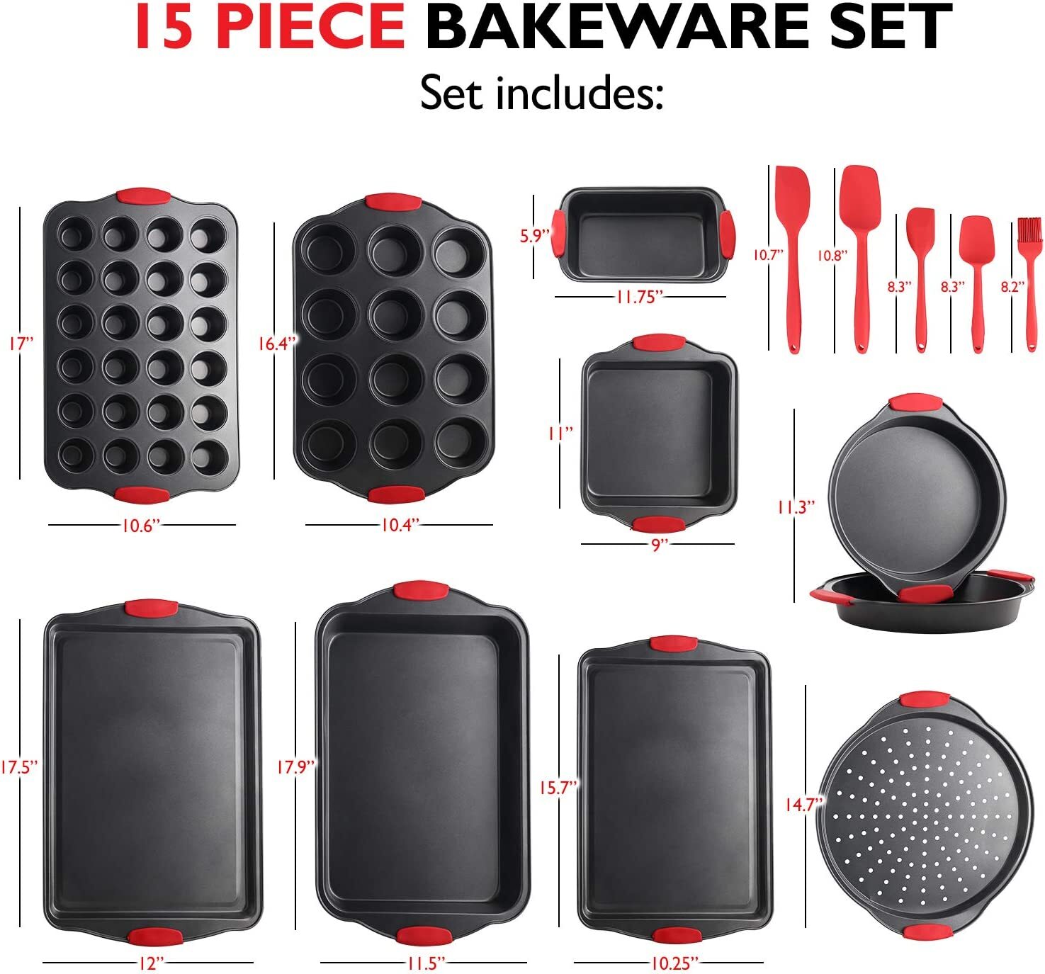 - 15-PIECE BAKEWARE SET: The 15-Piece Baking Pan Set offers a complete durable nonstick bakeware set. Includes baking pan, pizza pan, small cookie sheet, 2 round pans, square pan, loaf pan, big cookie sheet, 12 & 24 cup muffin pans, and 5 silicone spatualas.