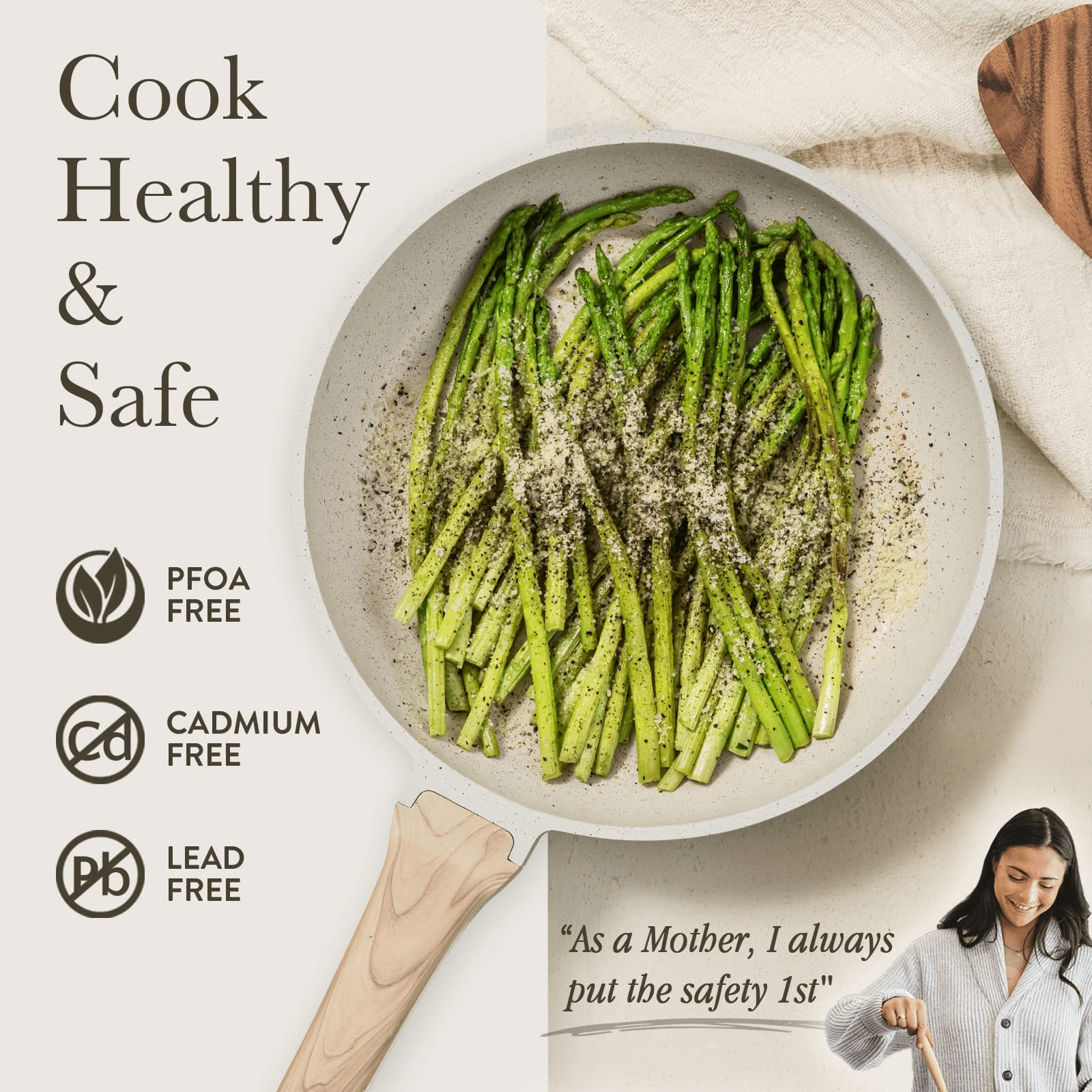 • Eco-friendly Nonstick Granite Material High-quality nonstick granite material, SGS approved with 100% Free of PFOS, PFOA,our pans set ensures your daily cooking being always safer and healthier.