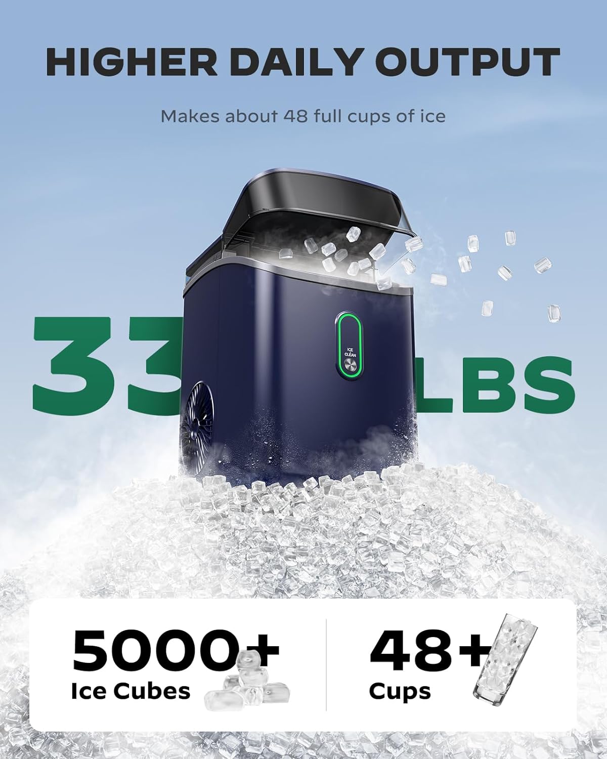 - ✔Effective Ice-Making: The daily output of 33 lbs is about 48 cups (8.5 fl oz) full of nugget ice. It easily meets the needs of large families and parties. Make great iced tea, coffee, or cocktails. Even chill beers and keep food fresh.