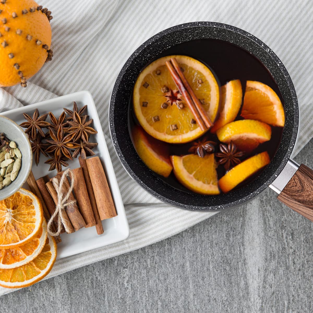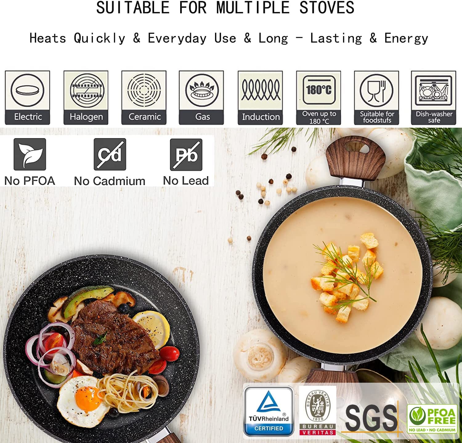 • Suitable For All Stoves – High magnetic conductive stainless steel base allows our non stick granite kitchen cookware to work on all cooktops, like Electric, Halogen, Ceramic, Gas, Induction and Oven. The Extended and Thicken Bottom Design also makes the cookware durable and heats up quickly and evenly.