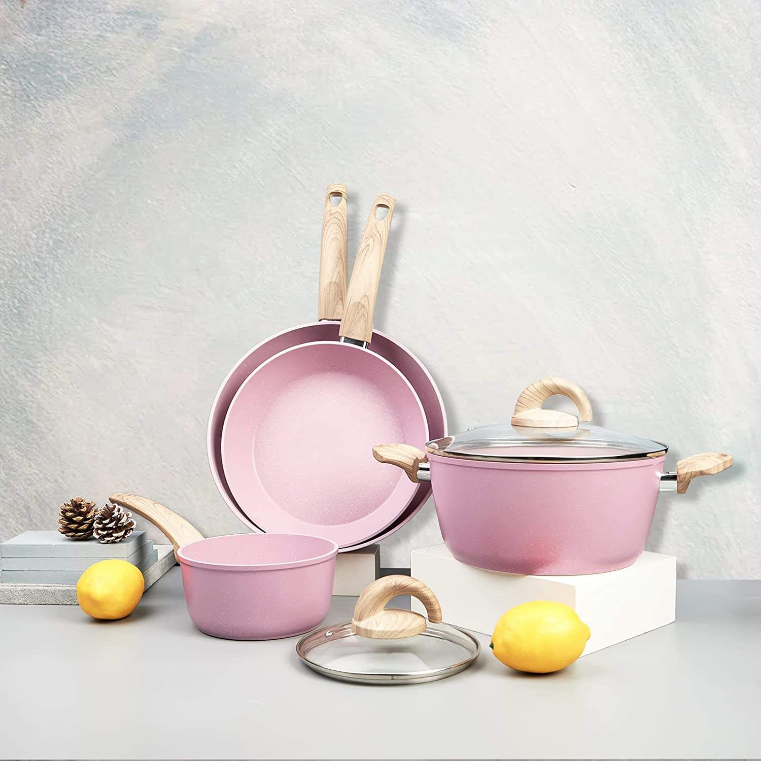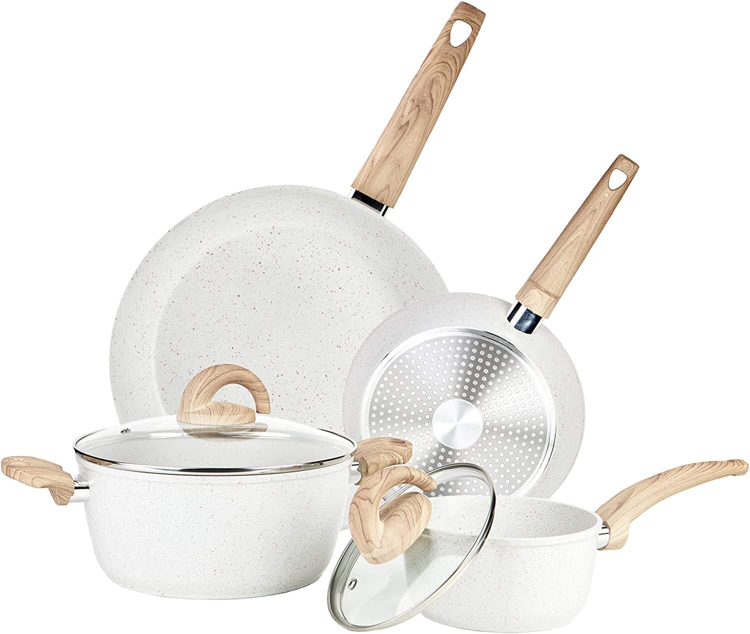 • Suitable For All Stoves – High magnetic conductive stainless steel base allows our non stick granite kitchen cookware to work on all cooktops, like Electric, Halogen, Ceramic, Gas, Induction and Oven. The Extended and Thicken Bottom Design also makes the cookware durable and heats up quickly and evenly.