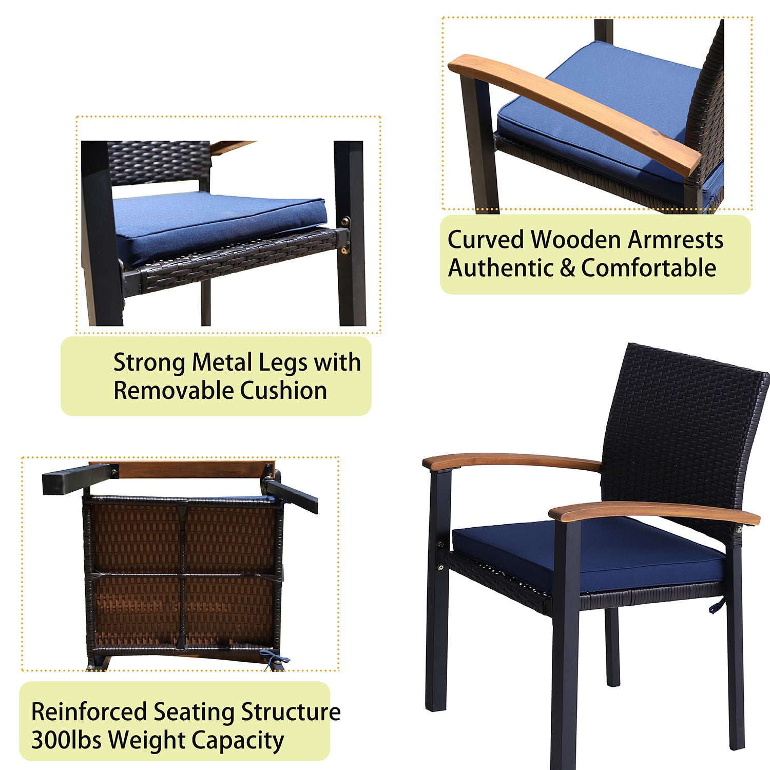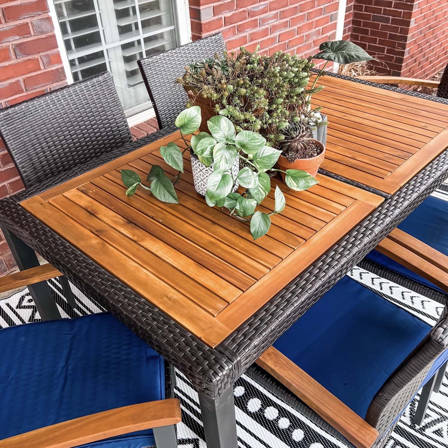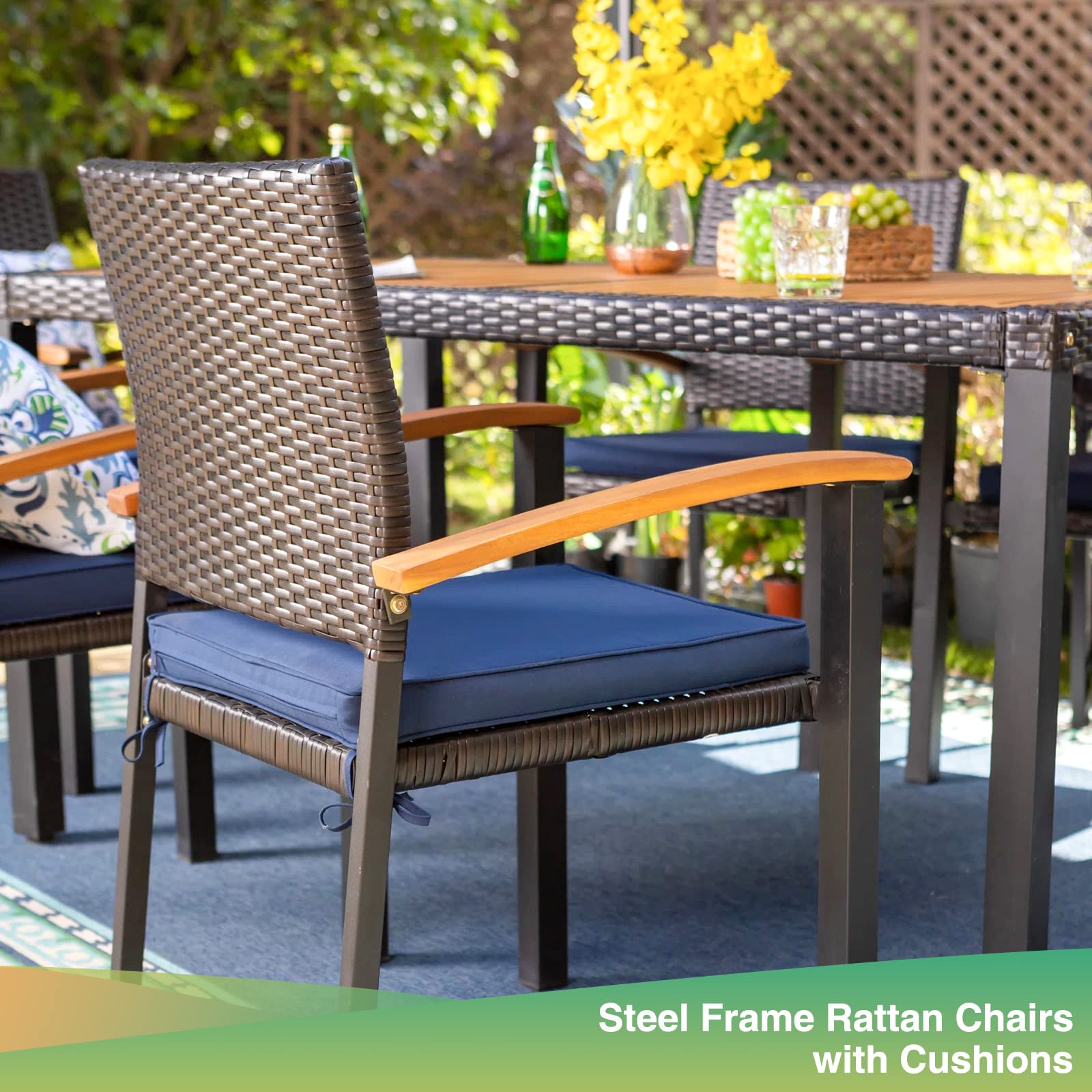 7-Piece Patio Outdoor Dining Set With Acacia Wood Rectangle Table and 6 Rattan Wooden Armrest Dining Chairs