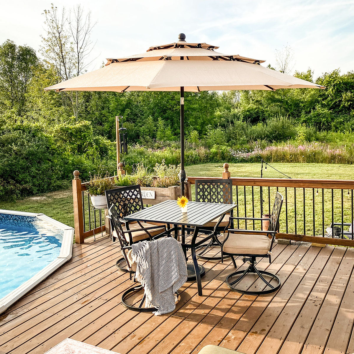6-Piece Outdoor Dining Set with 10ft Umbrella & Square Table & Swivel Metal Steel Chairs