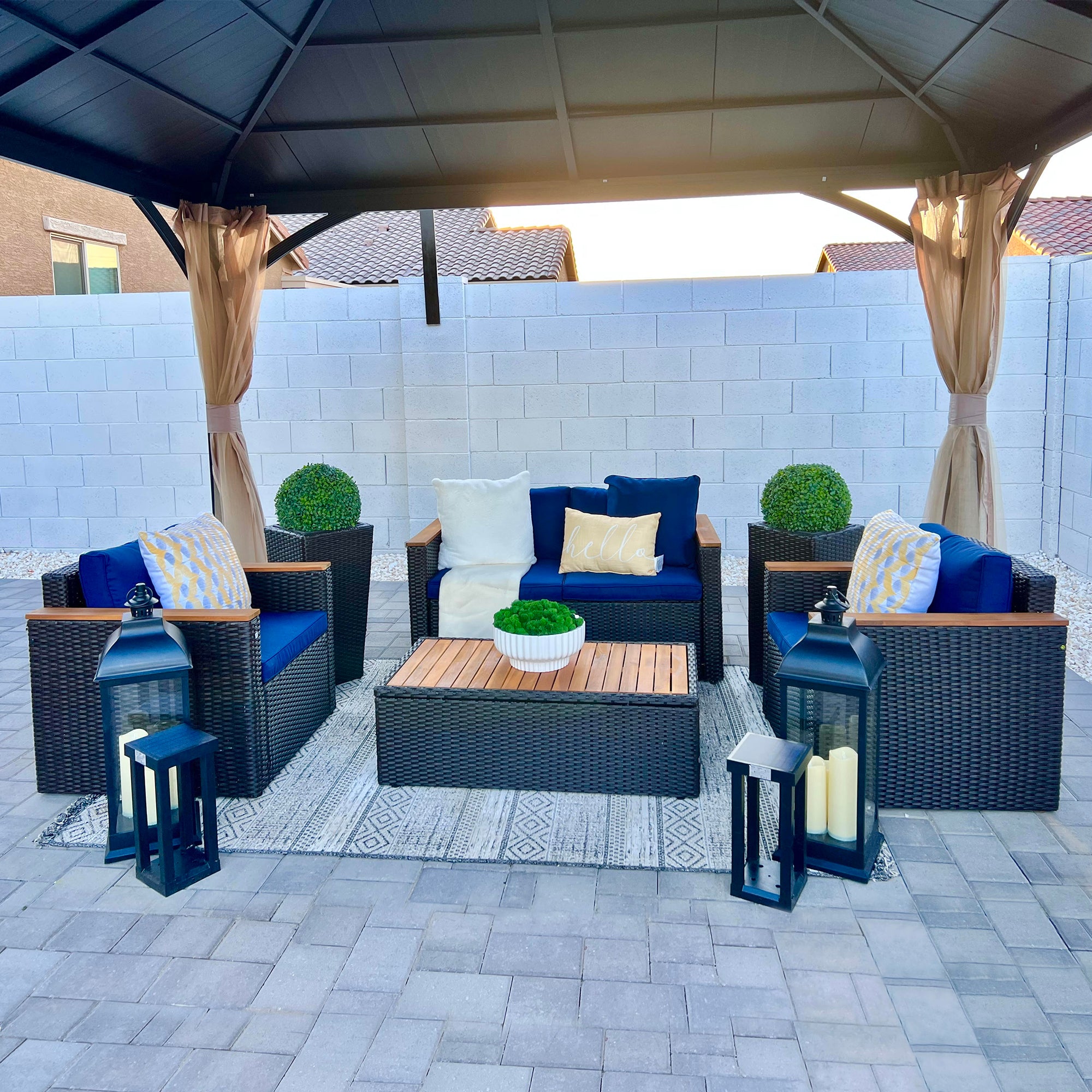4-Piece Outdoor Rattan & Wood Sectional Sofa Conversation Set With Cushions