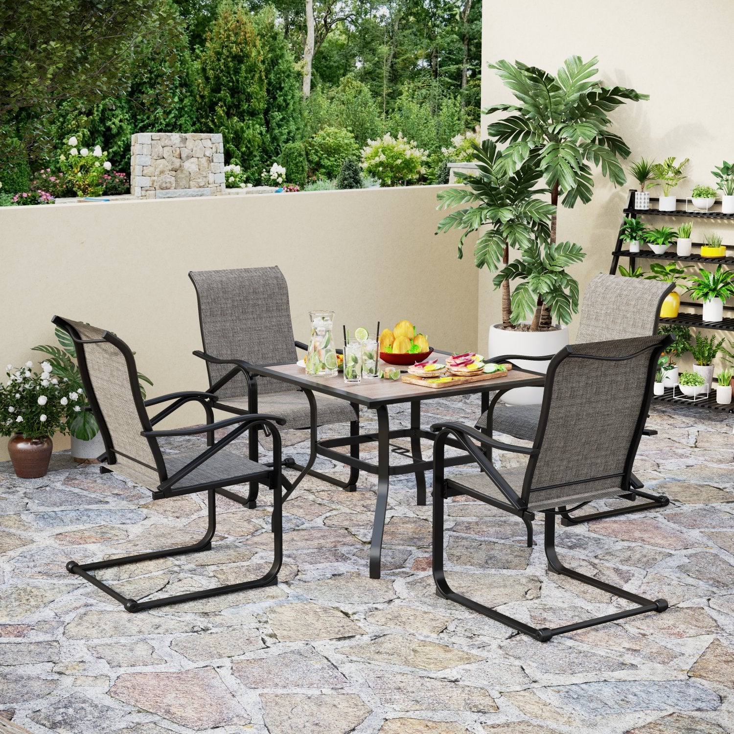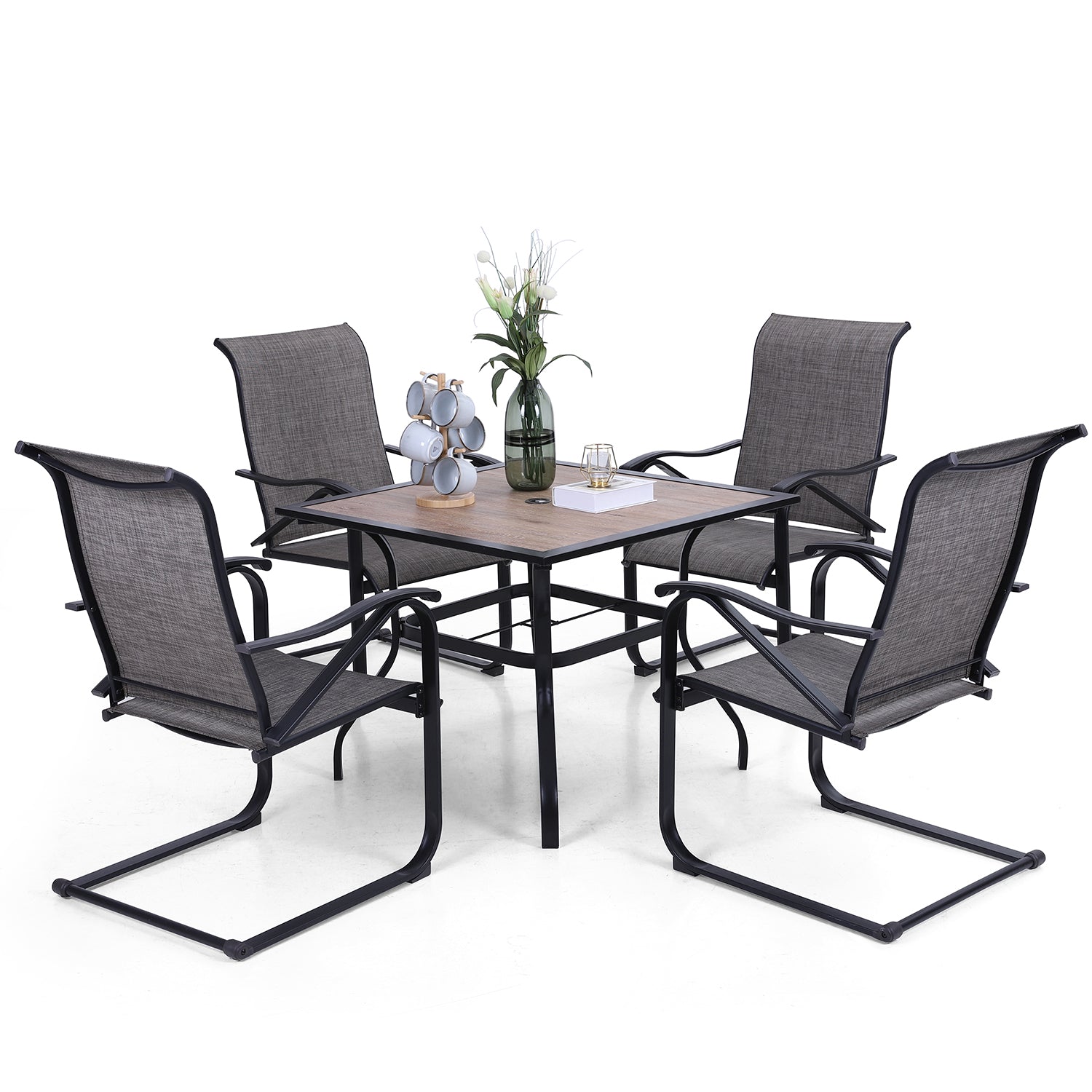 Phi Villa 5-Piece Outdoor Dining Set Wood-look Square Table & 4 Textilene C-spring Chairs