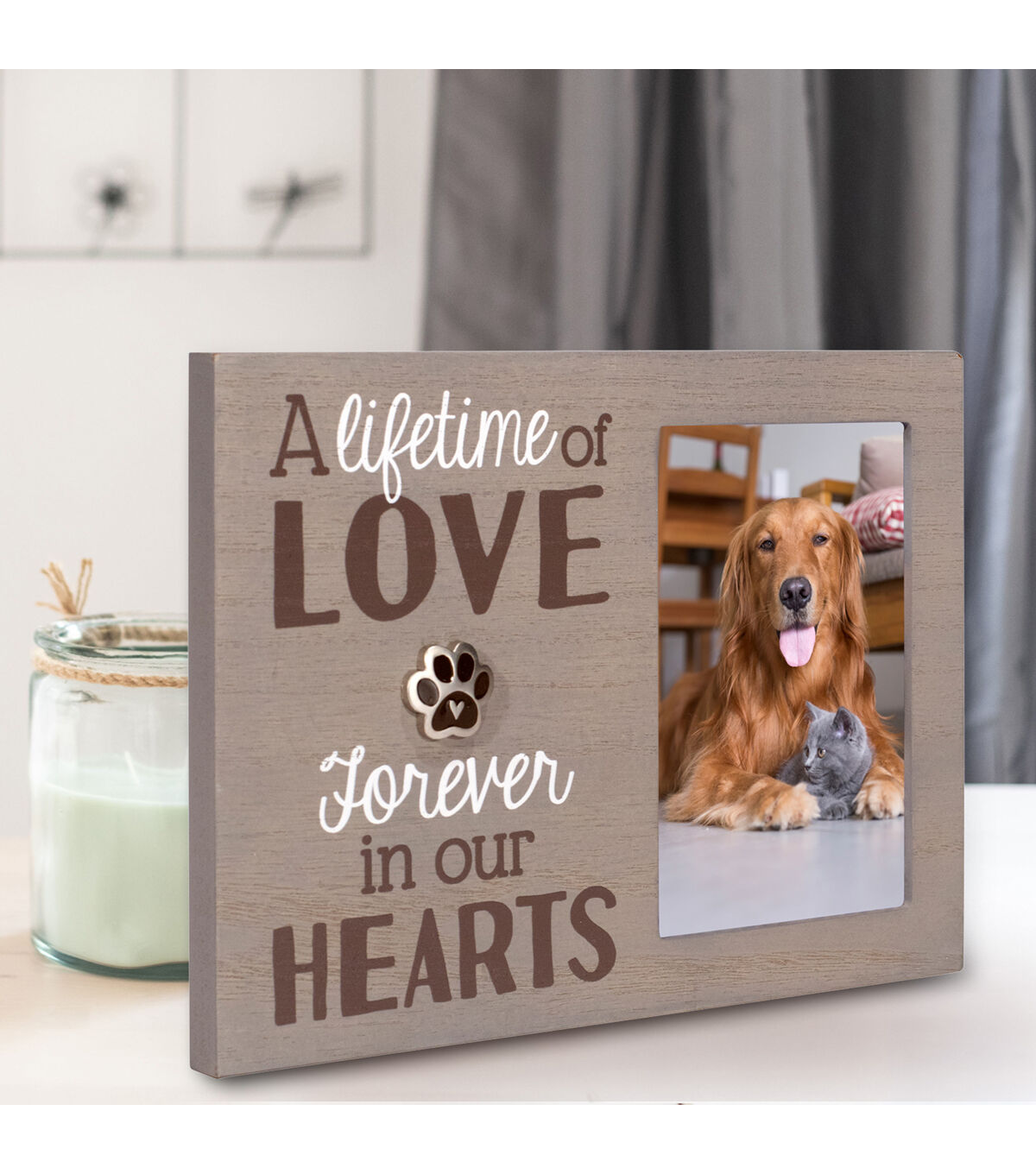 Sentiment picture frames are the perfect way to display your most treasured photos. This memorial pet frame holds one 4” x 6” vertical photo. The frame is constructed of quality MDF wood handcrafted with a textured surface. The brown frame is printed with white and brown words accented by a matte silver and shiny brown dimensional paw print attachment. This decorative frame features the remembrance phrase “A lifetime of love Forever in our hearts”. The picture frame has an easel back, making it ideal to for displaying on a tabletop or shelf. Included in the frame is a durable glass front that will protect and showcase your photo for years to come. Create a loving display of treasured memories with Malden International Designs’ Pet Sentiment frames.