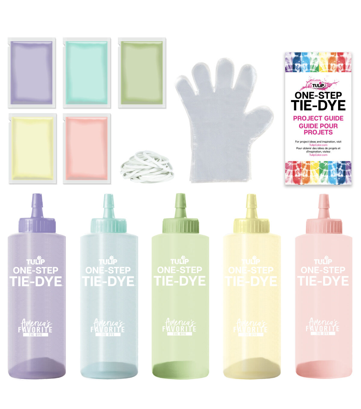 - 5 (4-oz.) dye bottles (pale peach, mint, lemon, lavender and avocado) and 5 dye refill packets (one of each color), plus gloves, rubber bands, and an inspiration guide