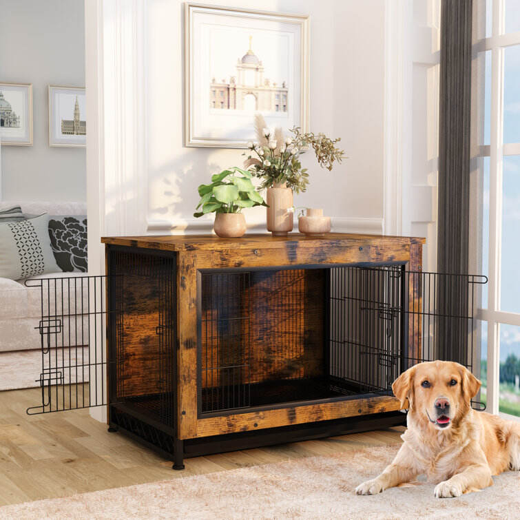 Industrial Style Rustic Brown Wooden Dog Kennel With Three Doors, Indoor Pet Furniture Dog Crate End Table