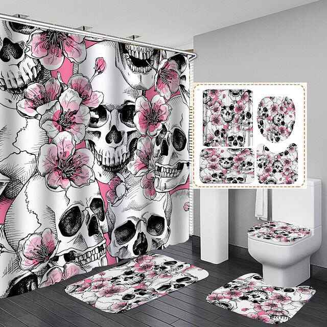 Skull Print Pink Flowers Shower Curtain Set with Bath Mat Carpet Toilet Cover