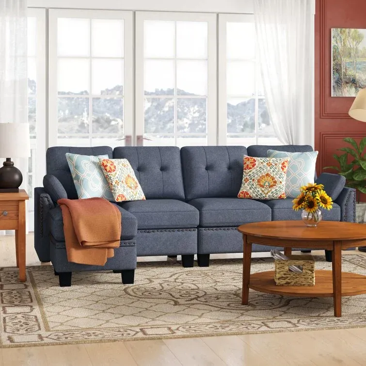 This sectional with reversible chaise lounge has a sleek modern look that will look great with any style in your home. Soft fabric upholstery on a hardwood frame with overstuffed back cushions and foam seat cushion. The more you sit on This sectional sofa couch the better. Enjoy cozy family movie nights and host classy cocktail parties alike all at this stylish sectional sofa. Perfect for apartment, condo, loft, bungalow, house. The perfect centerpiece for your seating arrangement, it blends contemporary appeal with simple sophistication. The upholstery is accented with a jumbo stitch detailing and tufted accent for a refined yet understated look. The sofa couch and the chaise can be separated if you need to make more space in your living room ensemble.