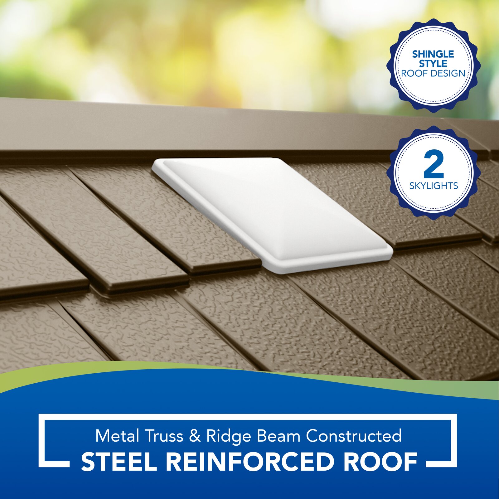 - Classic shed design with architectural details and metal-reinforced shingle-style roof panels