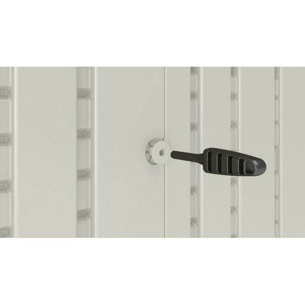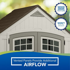 Make outdoor organization simple with this product. The capacity provides ample space to store large outdoor items such as garbage cans and recycling bins, long-handled garden tools, ladders, bikes, and more. It's durable, multi-wall resin construction is the weather, water, and UV-resistant and can withstand adverse weather conditions and wind gusts up to 60 mph. The double doors provide a wide opening to access items in the shed, and a padlock can be used to lock the unit for extra security (lock not included). The built-in vents allow for proper airflow, and multiple windows provide natural light and visibility into the shed. The reinforced floor provides extra support for heavier items such as tractors and ride-on lawnmowers with recommended install on a level, concrete foundation. It also offers convenient maintenance - simply wipe with a damp cloth for easy cleanup. This storage shed is easy to assemble with minimal tools required. The decorative siding panels and shingle-pattern roof make this shed an attractive and functional outdoor storage solution.