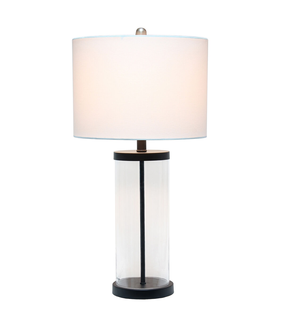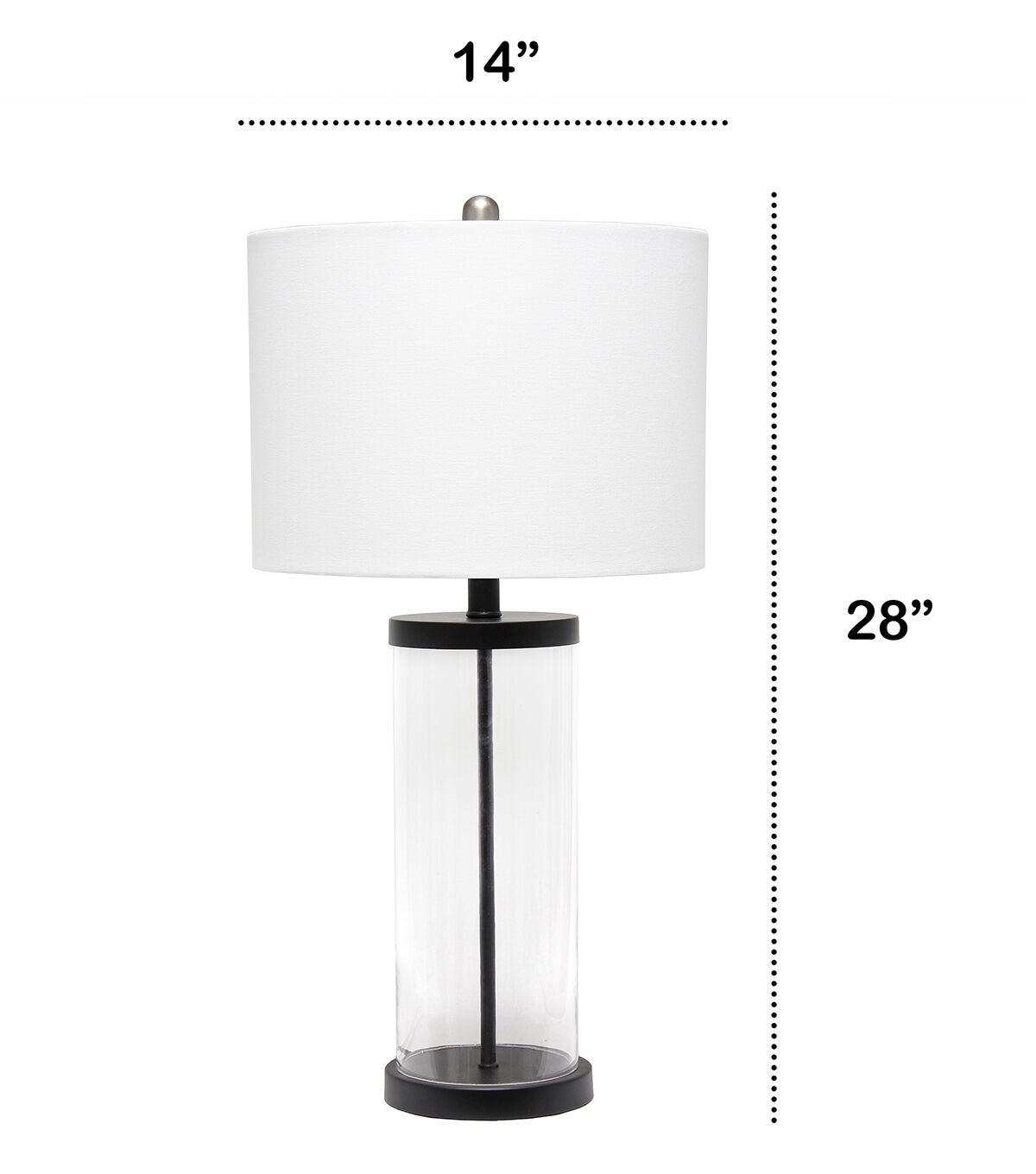 Classic yet contemporary this lamp will light up any room in your home with style! This lamp features a clear glass cylindrical base with black metal on top and bottom for a clean, sophisticated look. Perfect for your living room, bedroom, office, or anywhere you need to add a tasteful update!