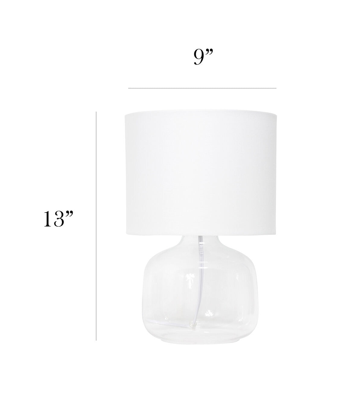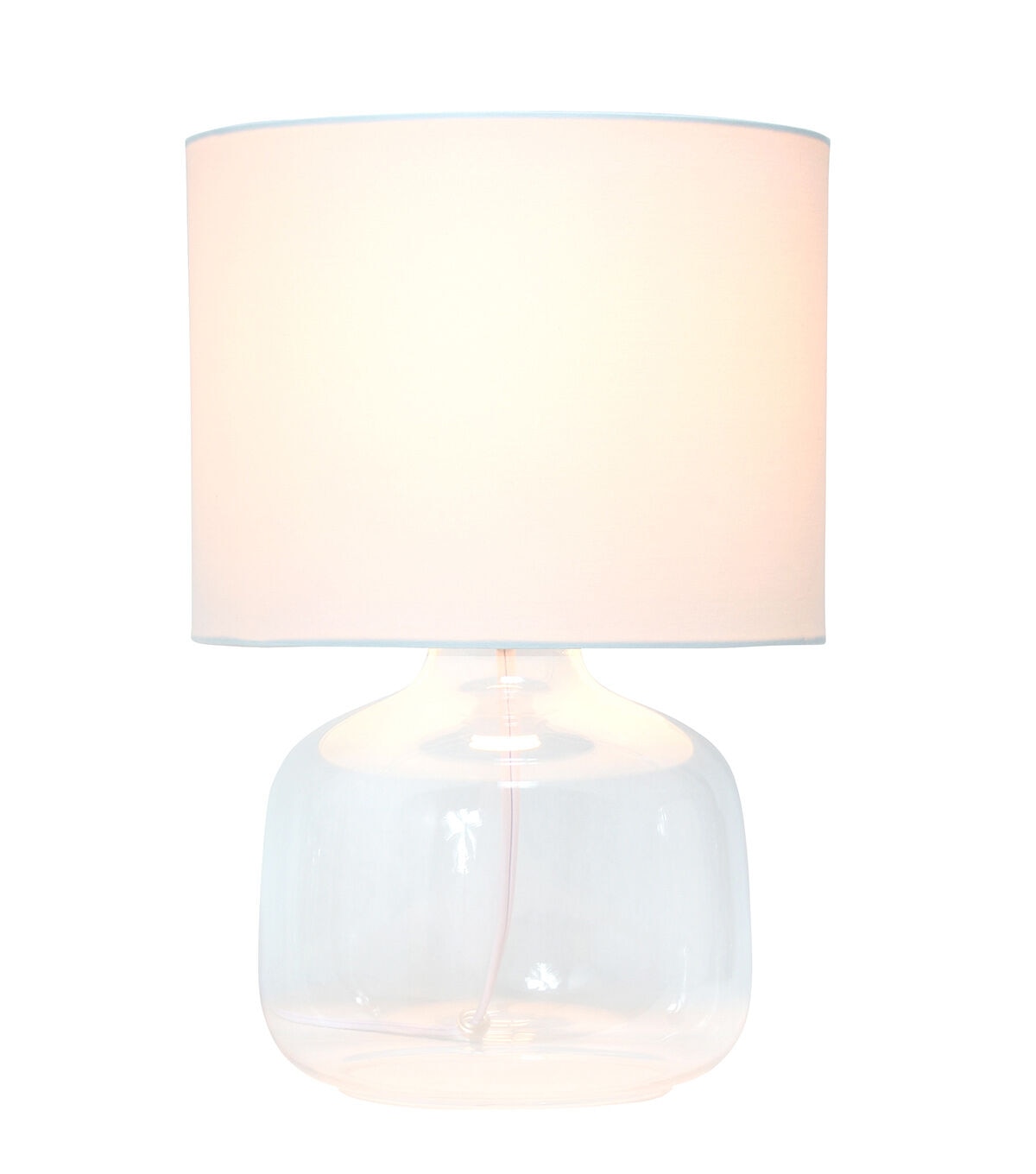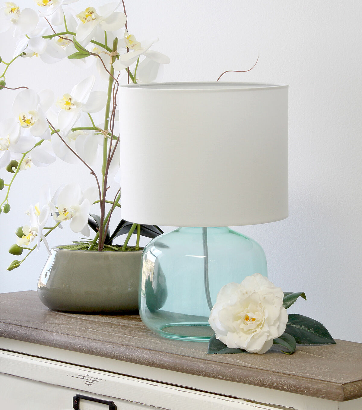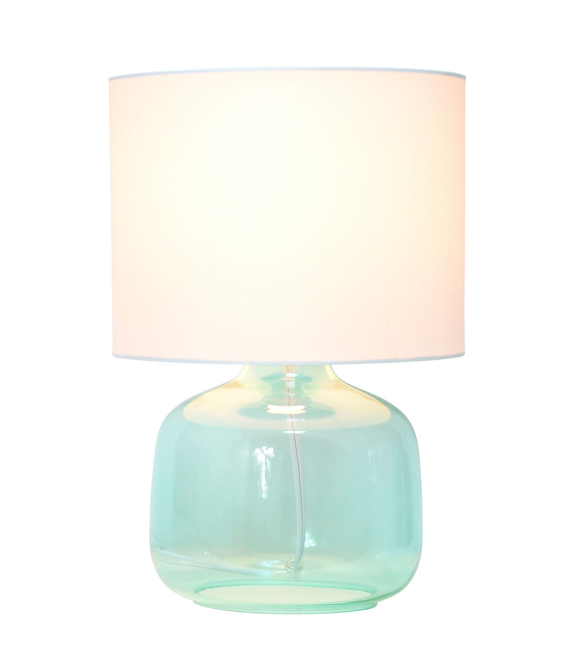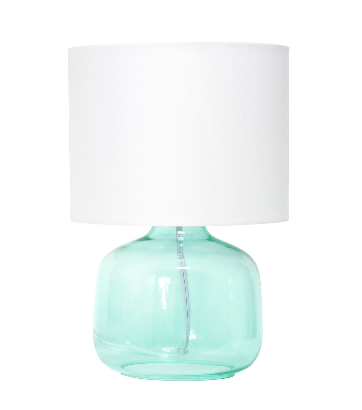 Illuminate your living space with this simple yet stylish glass table lamp. The aqua glass jar shaped base and white fabric drum shade is the perfect blend of charm to give your home a contemporary and modern upgrade. Perfect for living rooms, bedrooms, kids and teens, college dorms, apartments, nurseries, or offices.