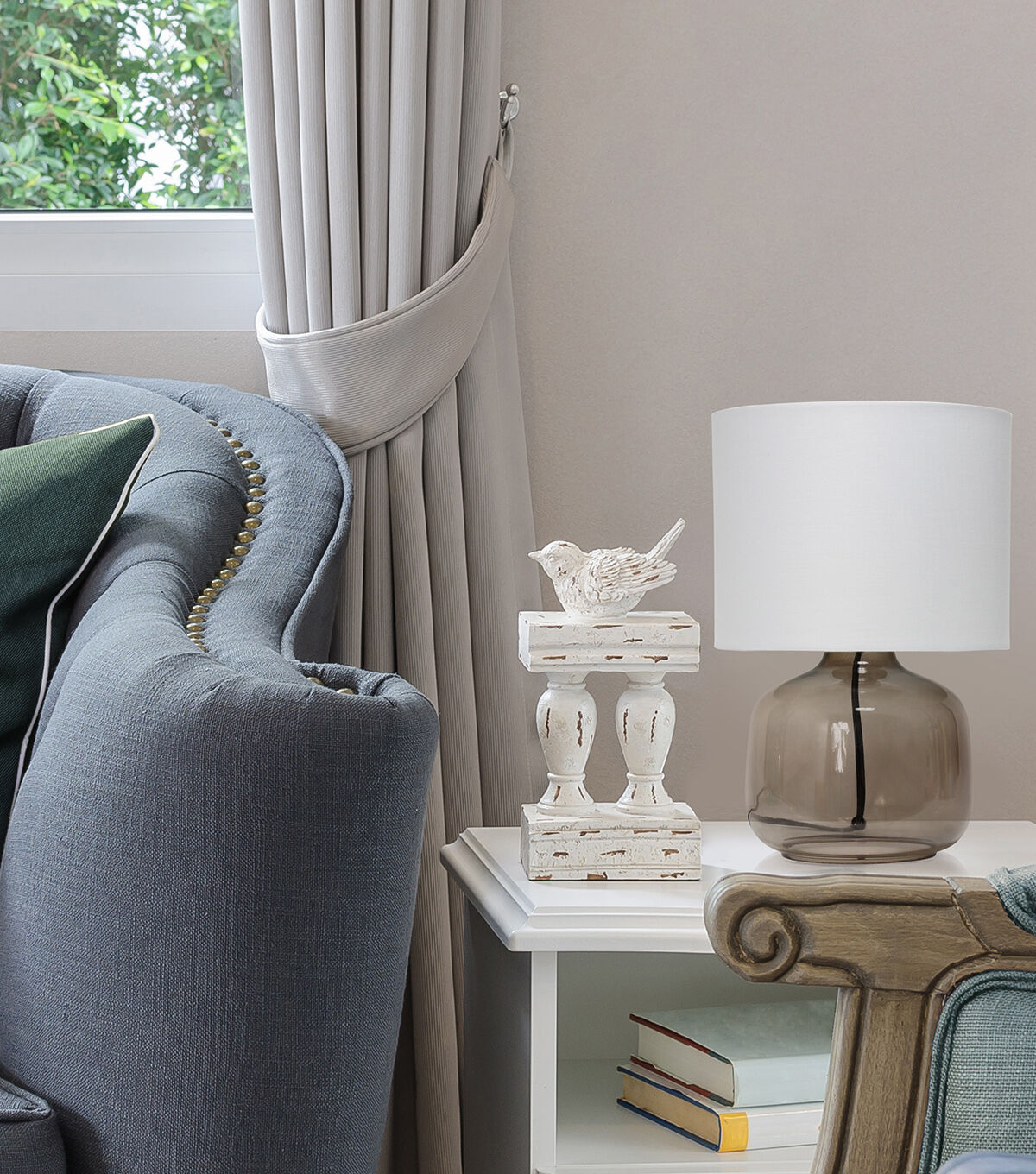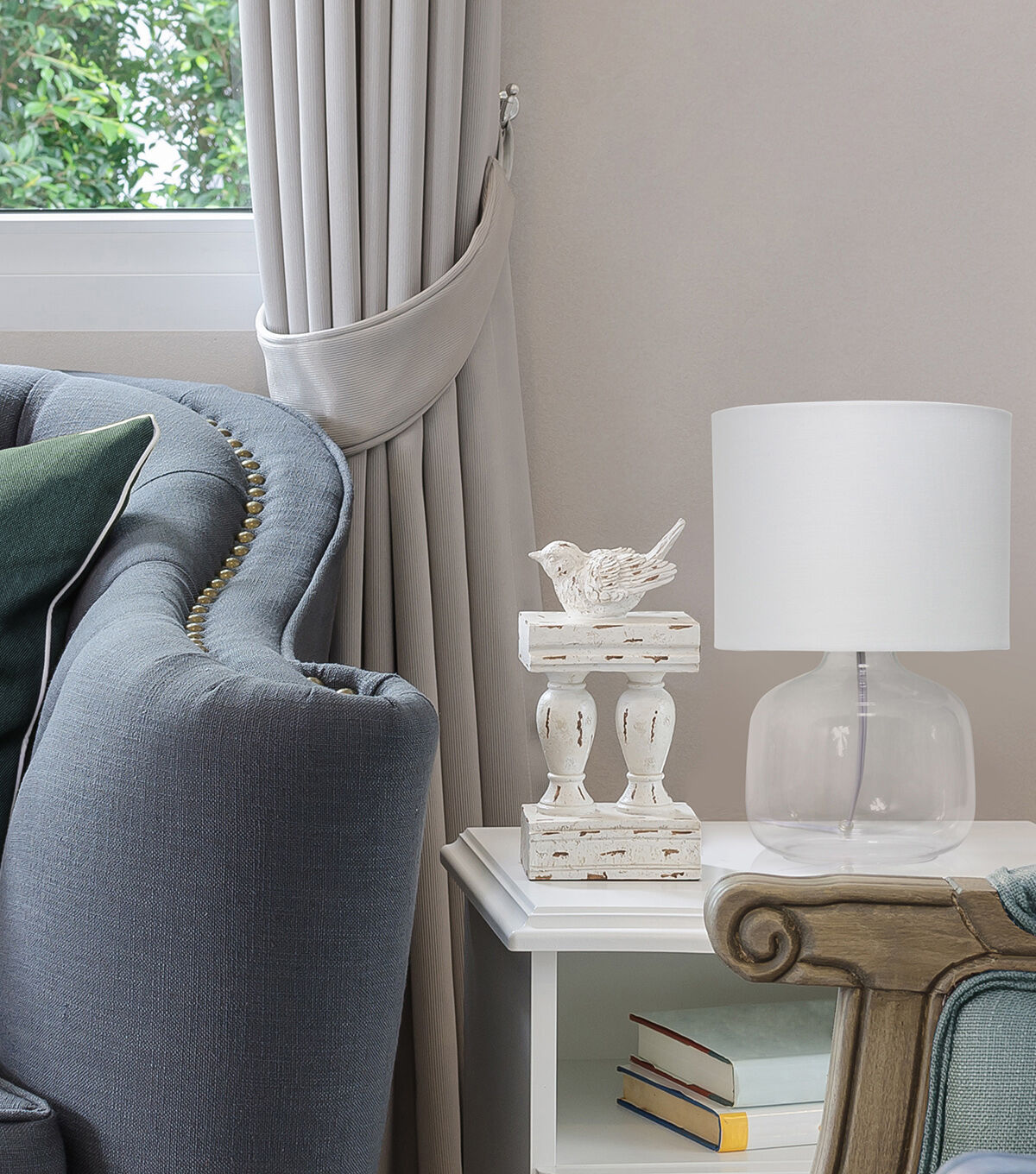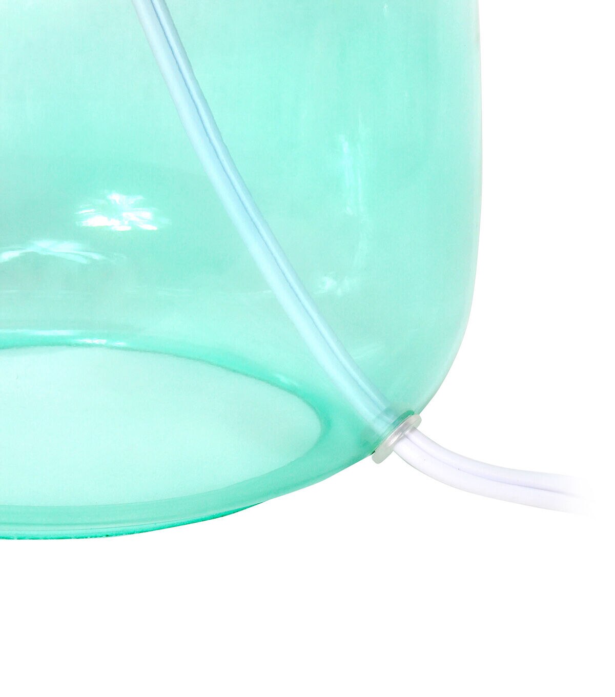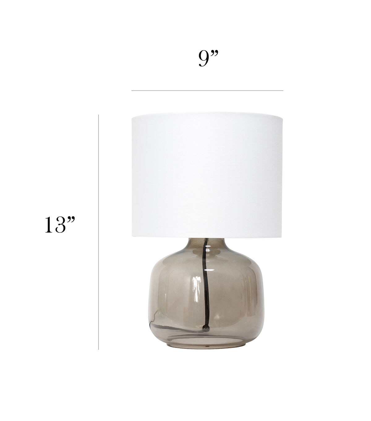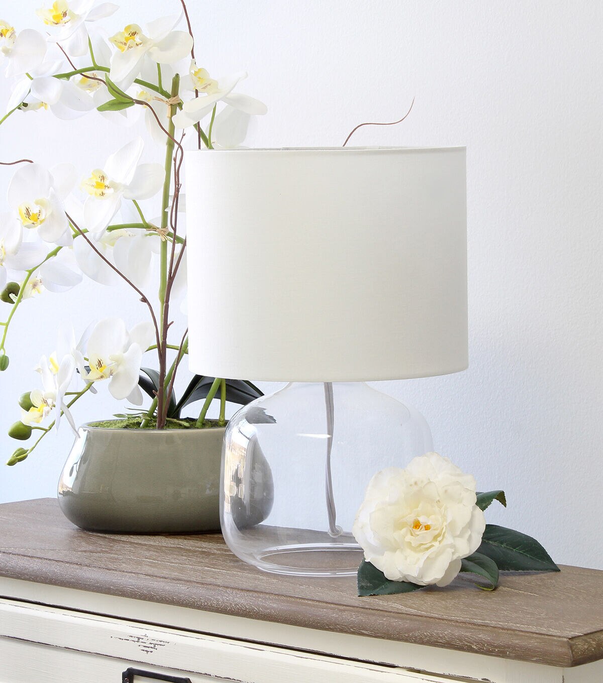 Illuminate your living space with this simple yet stylish glass table lamp. The aqua glass jar shaped base and white fabric drum shade is the perfect blend of charm to give your home a contemporary and modern upgrade. Perfect for living rooms, bedrooms, kids and teens, college dorms, apartments, nurseries, or offices.