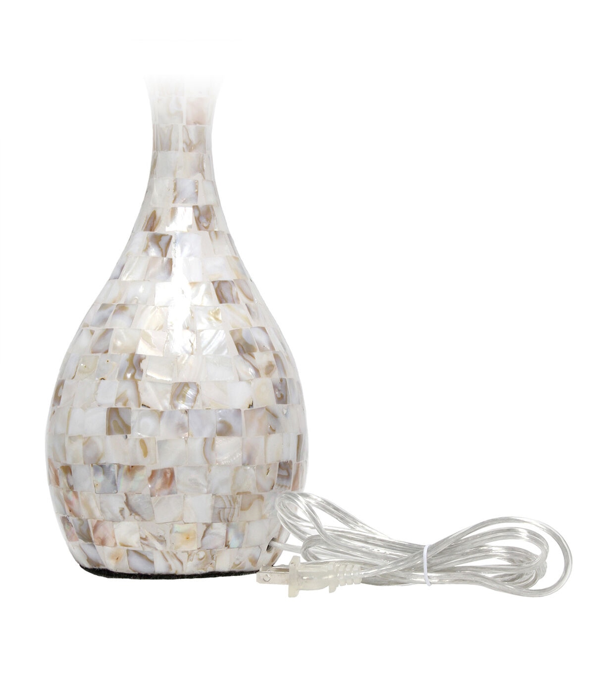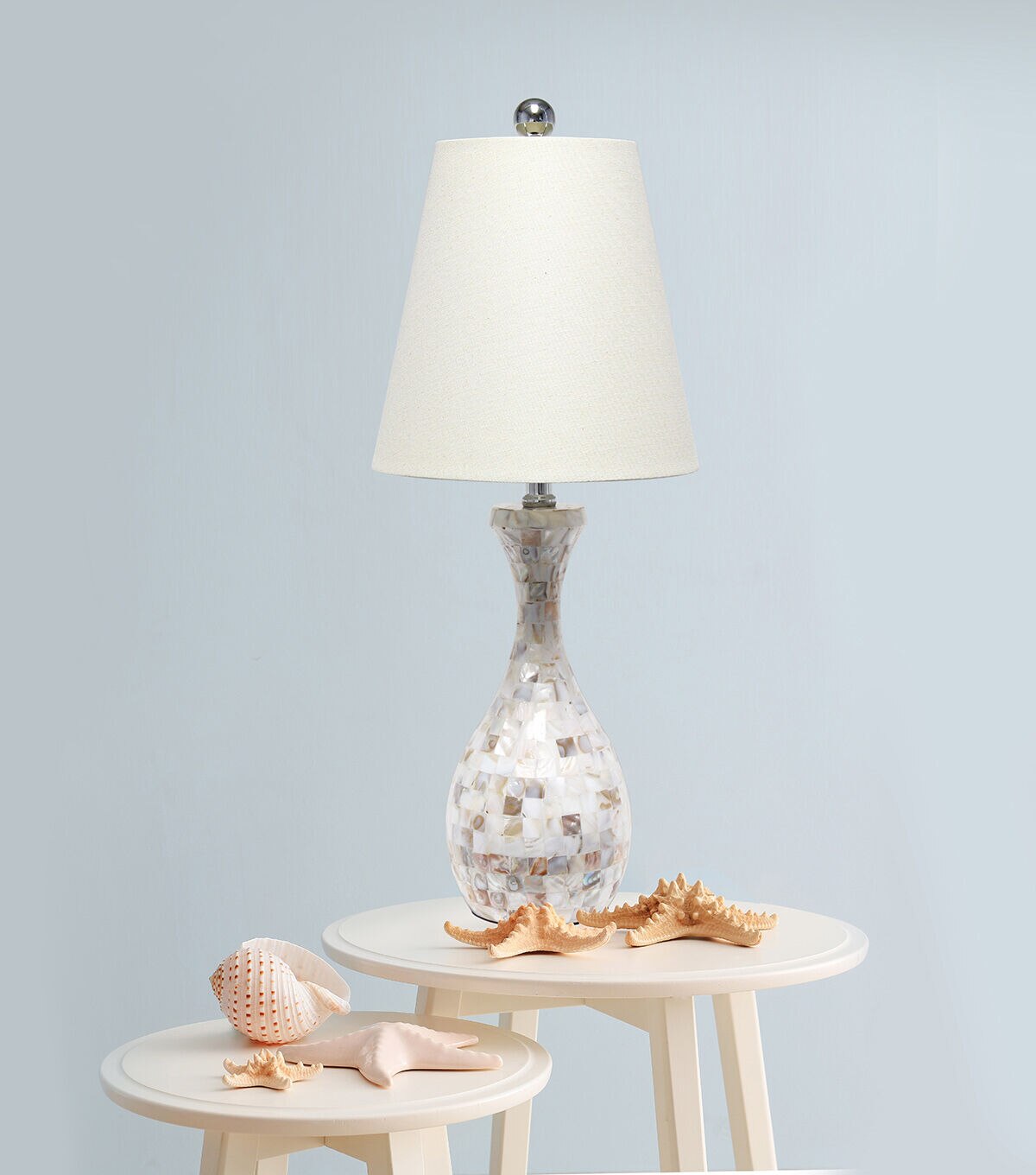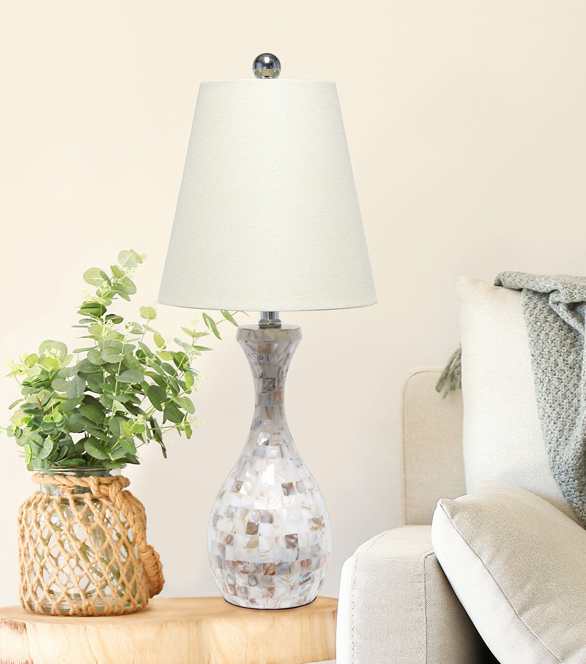 This trendy table lamp features a stylish Capiz shell look tiled in a mosaic pattern. Constructed from beautiful muted shades of coral, gray and white, this lamp is accented with an immaculate chrome finish and a fresh cream fabric shade. These slightly iridescent tiles and natural tones will add elegance and glamour to any room. Enhance your room with style and finesse with this simply beautiful table lamp!