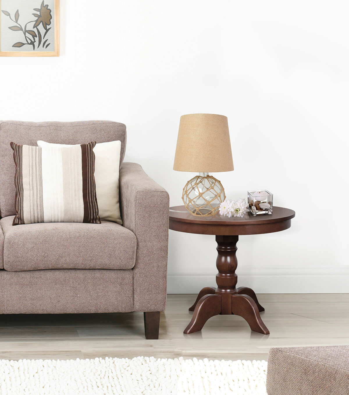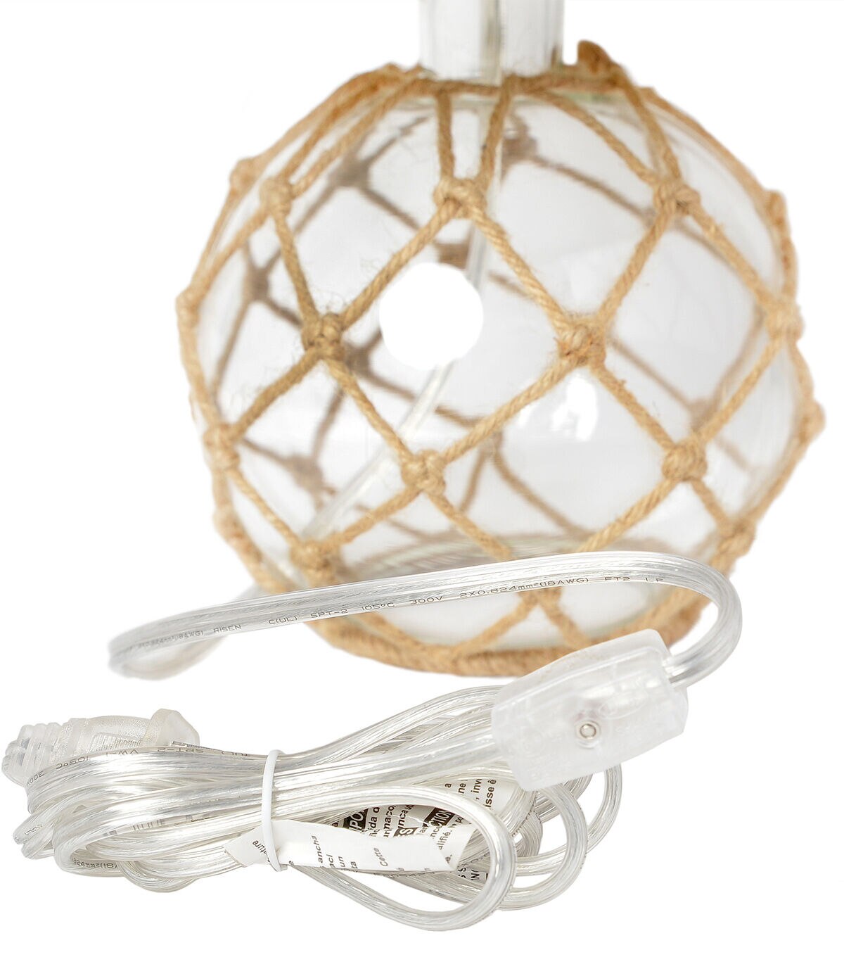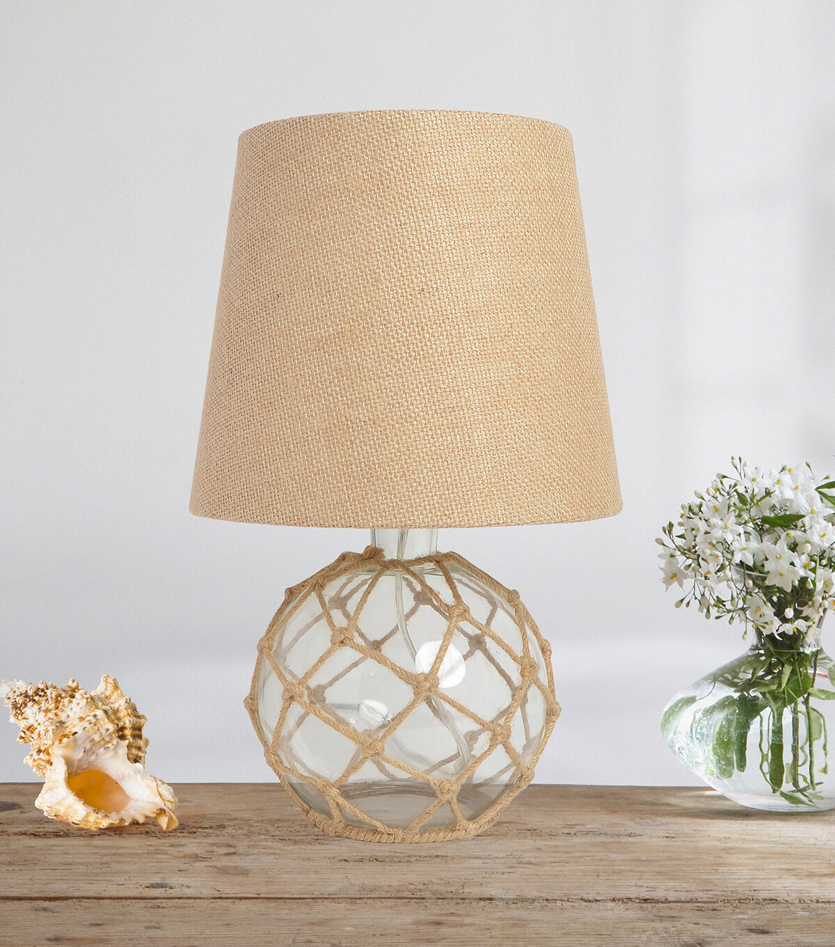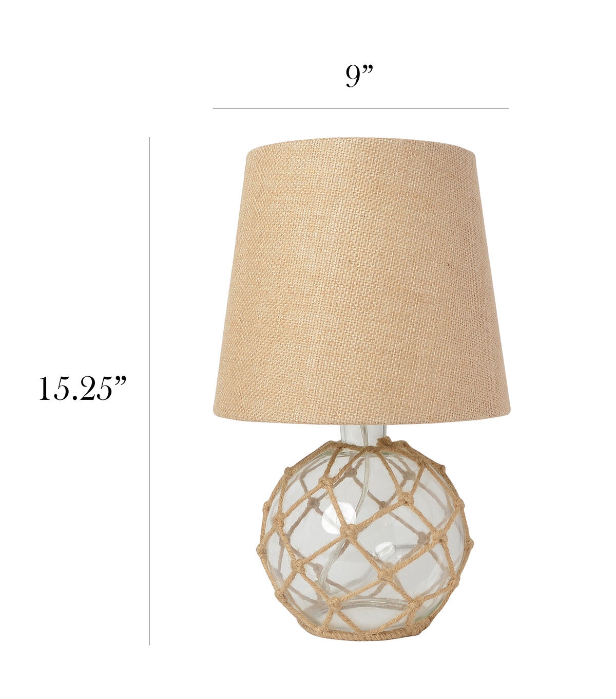 If you have that lovely beach house, condo, or rental you're looking to decorate, check out this nautical table lamp fitting for your coastal decor! The clear glass base is netted in a natural rope, complemented by a burlap empire fabric shade. This lamp is just over a foot tall making ideal to sit on your nightstand, dresser, in your living room, entry way, and just about any room in your home!