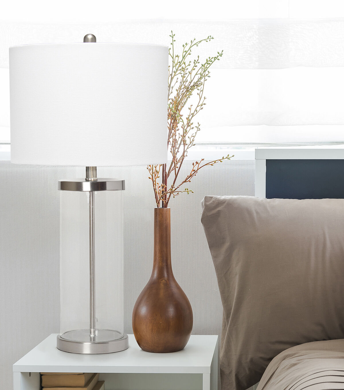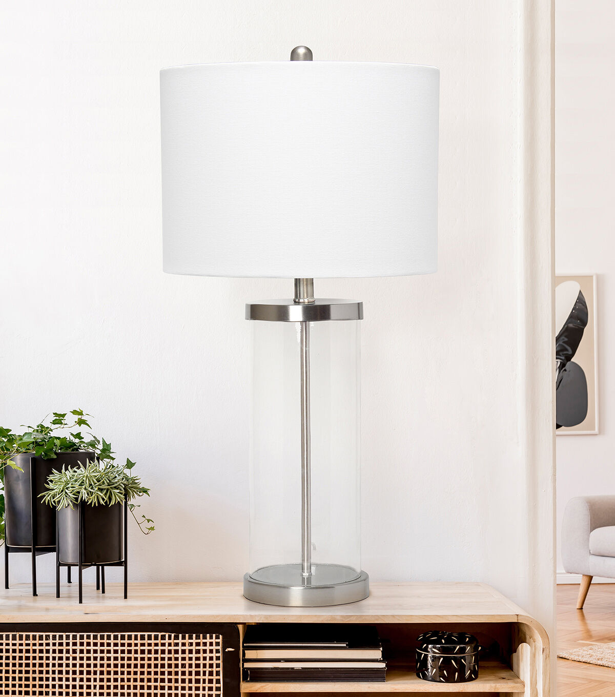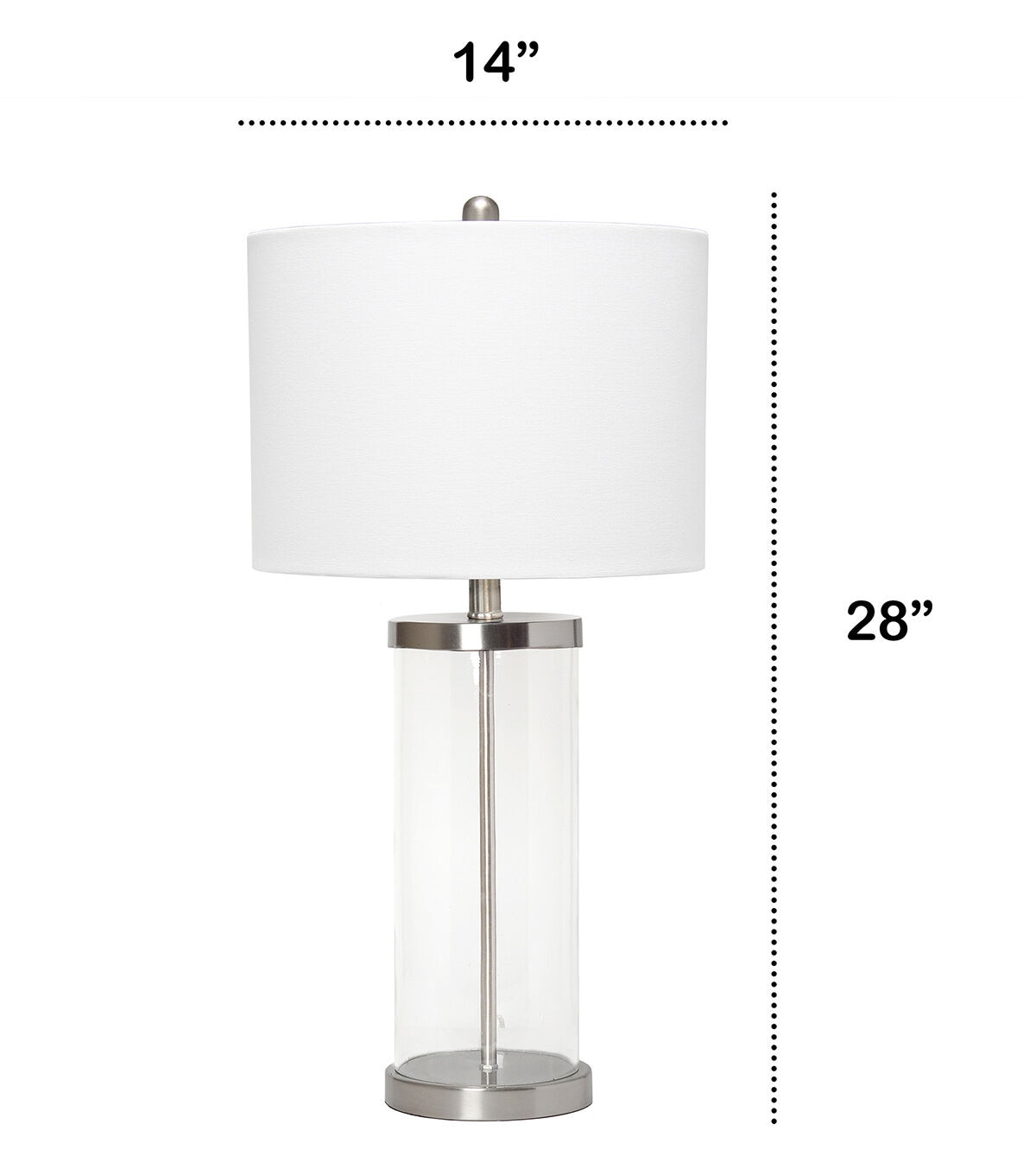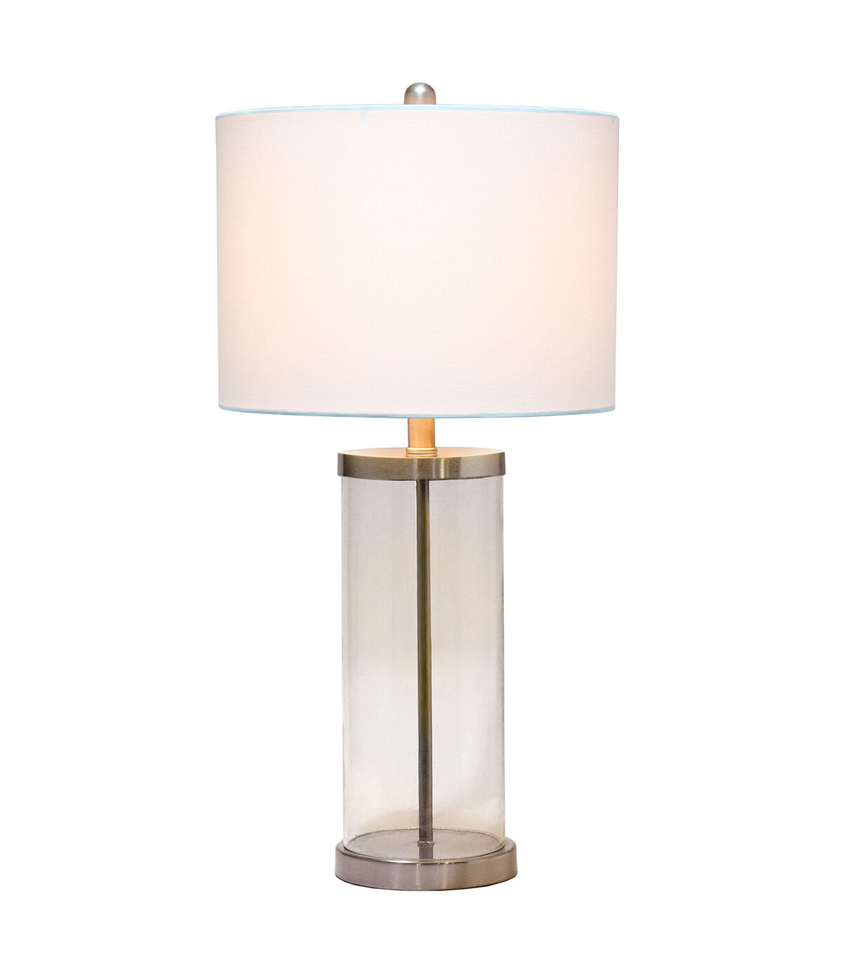 Classic yet contemporary this lamp will light up any room in your home with style! This lamp features a clear glass cylindrical base with brushed nickel metal on top and bottom for a clean, sophisticated look. Perfect for your living room, bedroom, office, or anywhere you need to add a tasteful update!