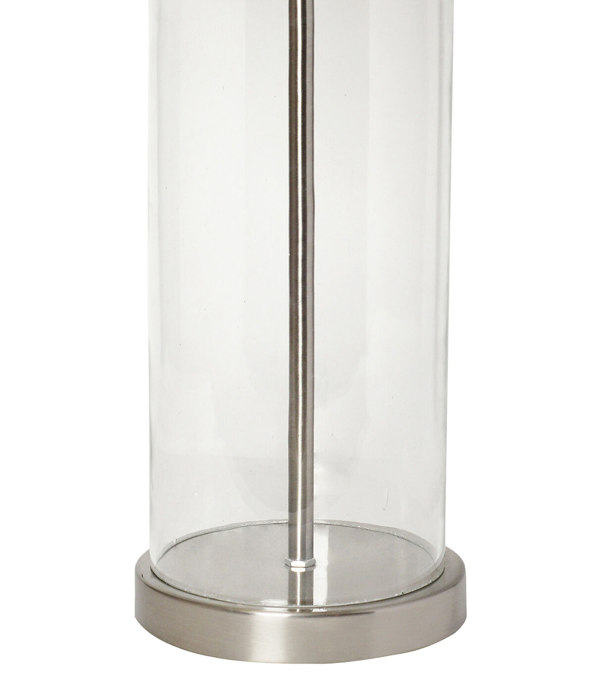 - Brushed nickel on top and bottom of clear cylindrical glass base