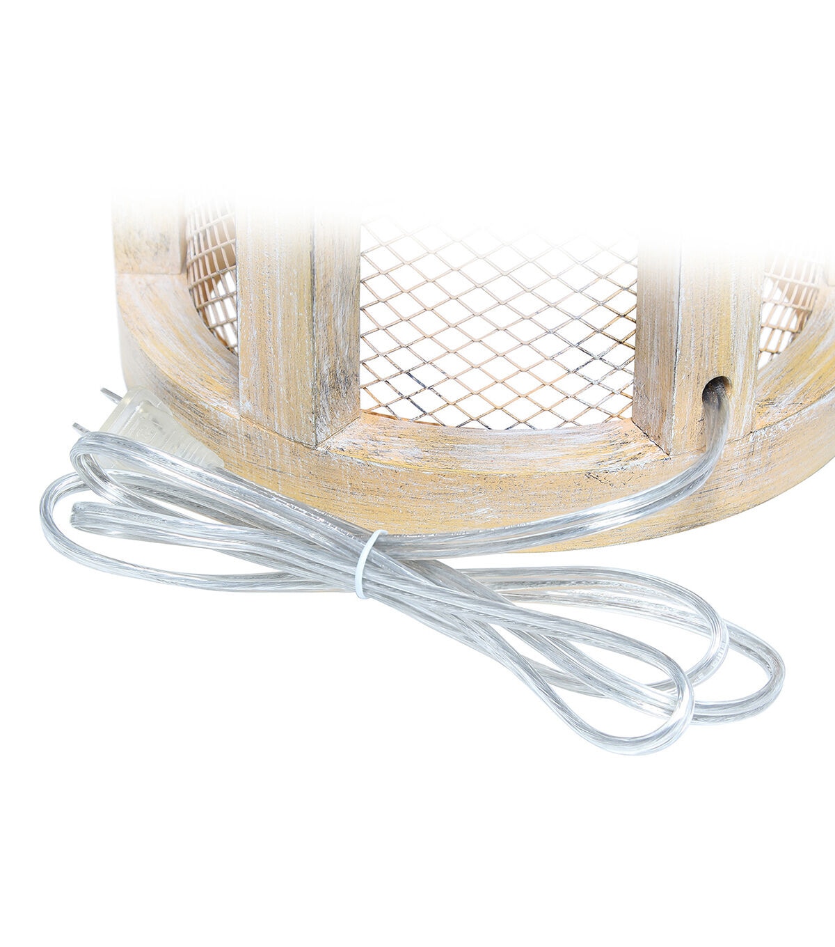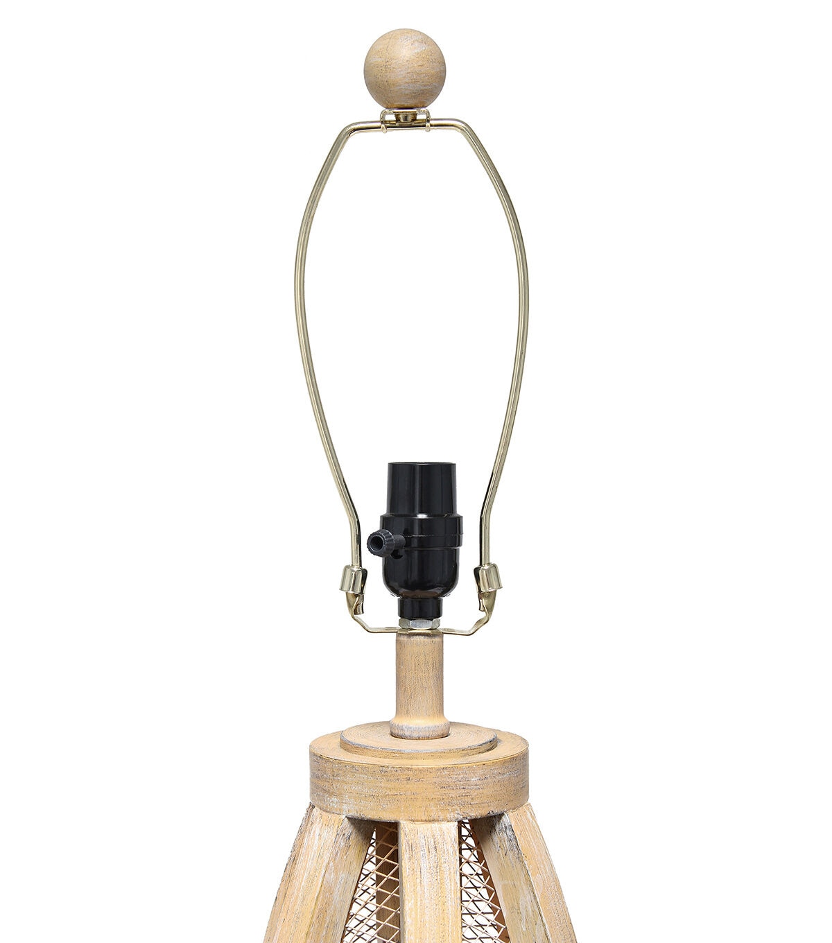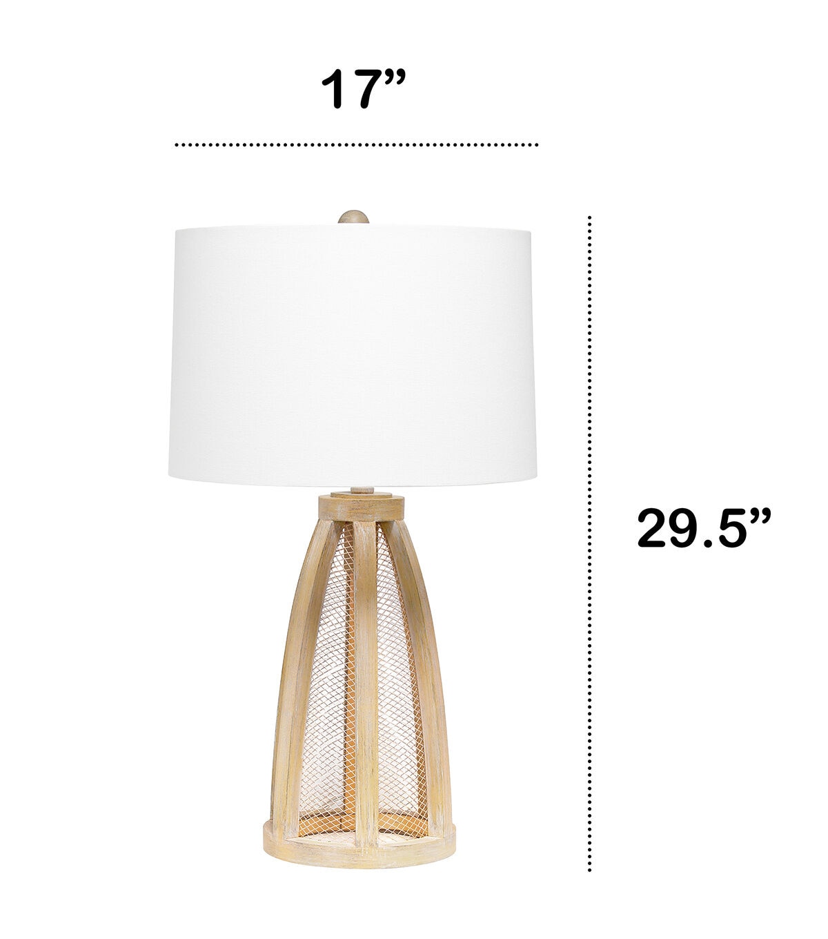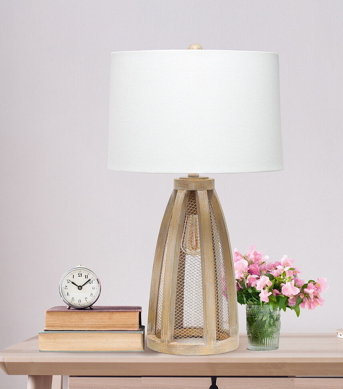 Add charm and character to your home with this rustic table lamp. The base features a weathered natural wood look and metal lattice complemented by a white fabric drum shade. Option to turn 1 light, 2 lights or both lights on, offering you different levels of brightness. Perfect for your living room, bedroom, office, or anywhere you need to add a little touch of farmhouse decor!