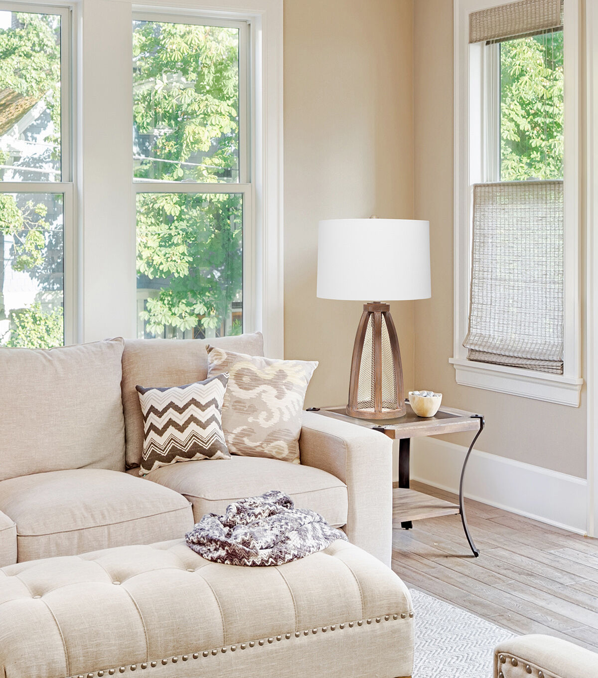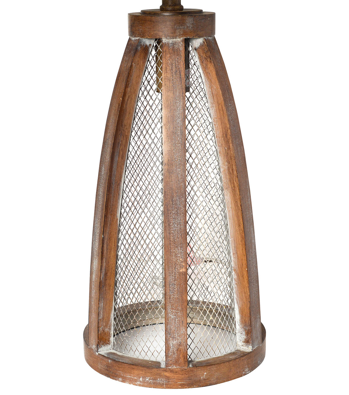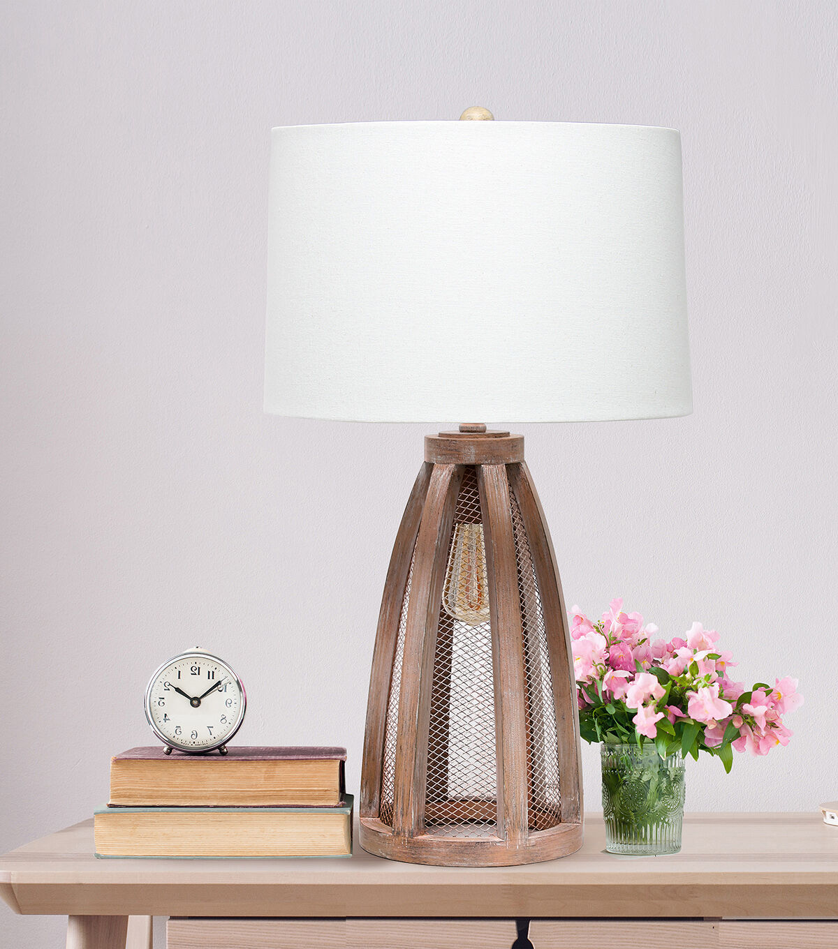 Add charm and character to your home with this rustic table lamp. The base features a weathered old wood look and metal lattice complemented by a white fabric drum shade. Option to turn 1 light, 2 lights or both lights on, offering you different levels of brightness. Perfect for your living room, bedroom, office, or anywhere you need to add a little touch of farmhouse decor!