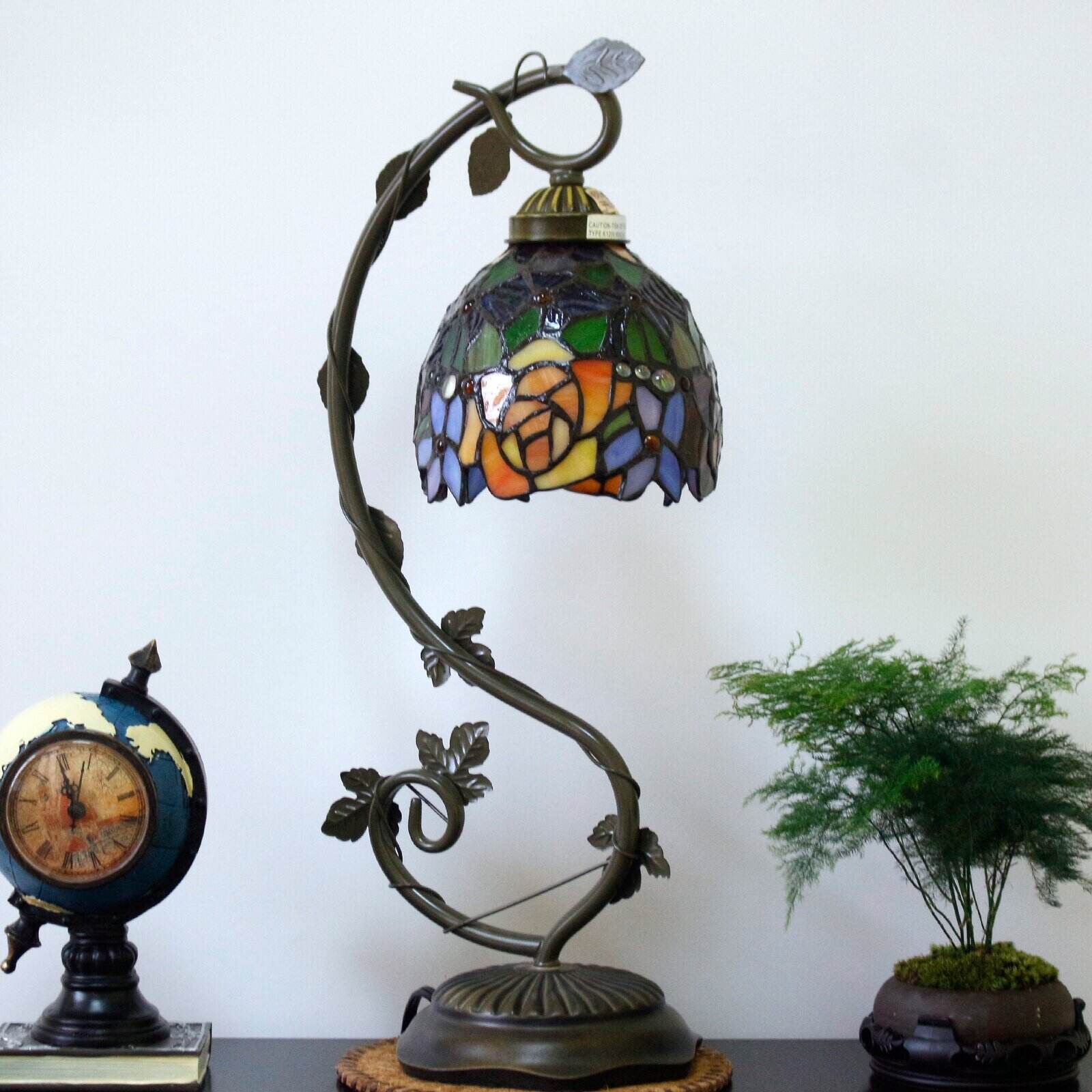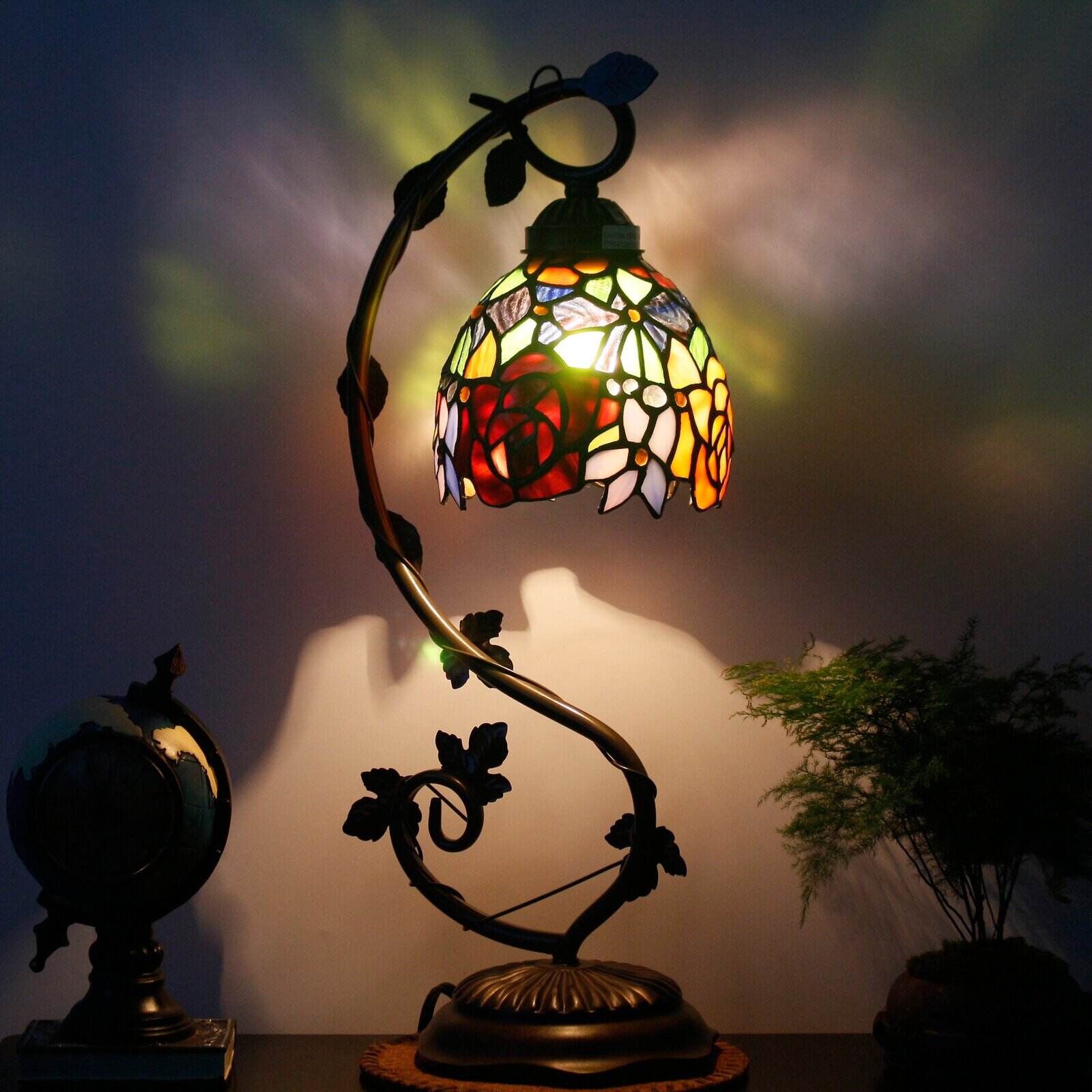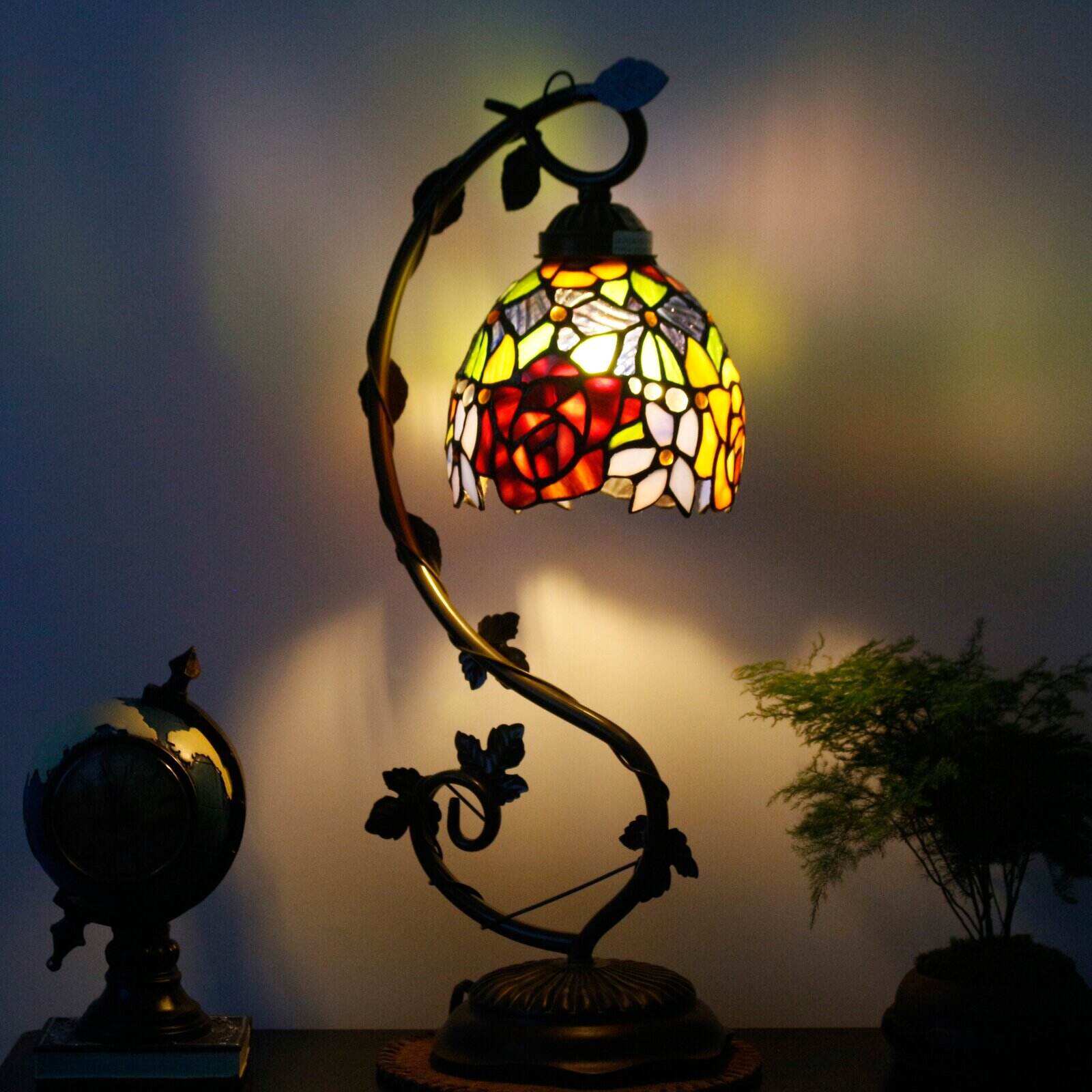 Bedside Table Lamp - World Menagerie Tiffany Style Stained Glass Lamp, Red Rose Nightstand Reading Desk Light W6H22 Inch S001, Lover Girlfriend Women Kid's Living Room Bedroom Office Coffee Bar Craft Gift