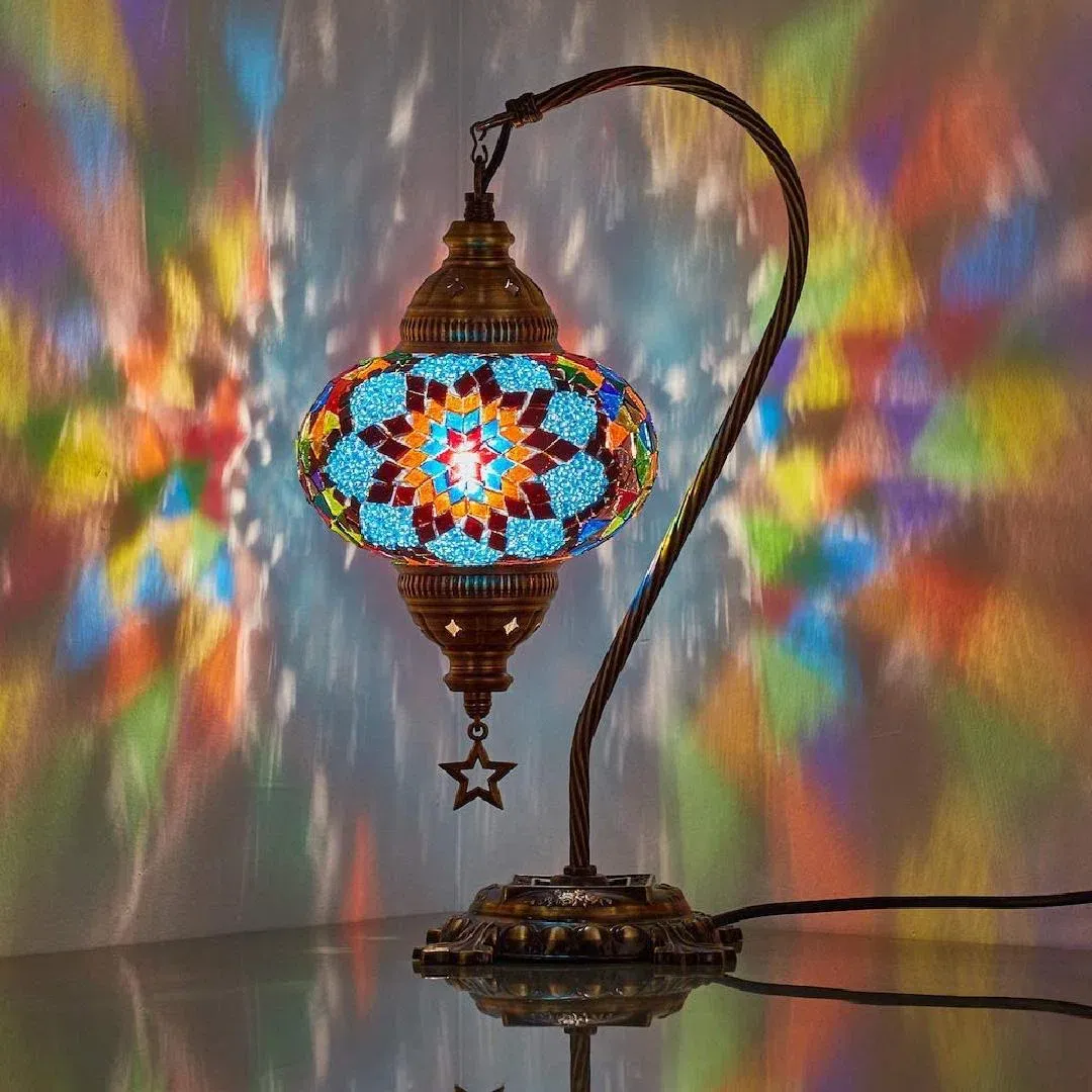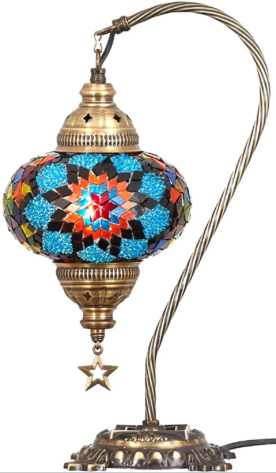 Turkish Moroccan Mosaic Table Lamp With US Plug & Socket, Swan Neck Handmade Desk Bedside Table Night Lamp, Decorative Tiffany Lamp Light, Blue